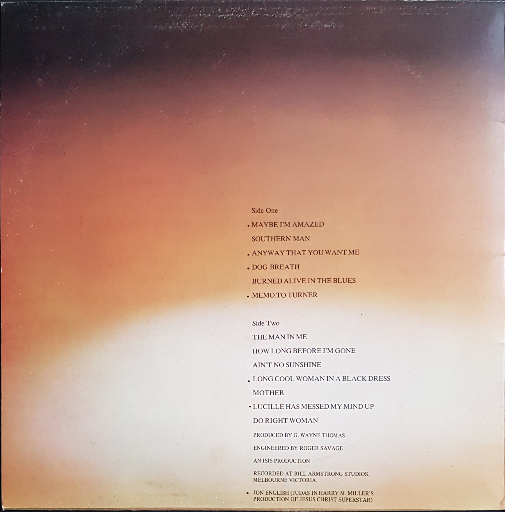 Gatefold Cover. 1975 Warner Bros. WS-20008. Features Jon English. Produced By G.Wayne Thomas. Minor wear and creases on cover. Silverfish damage along bottom of back cover and base of spine. Minor scuffs on disc.