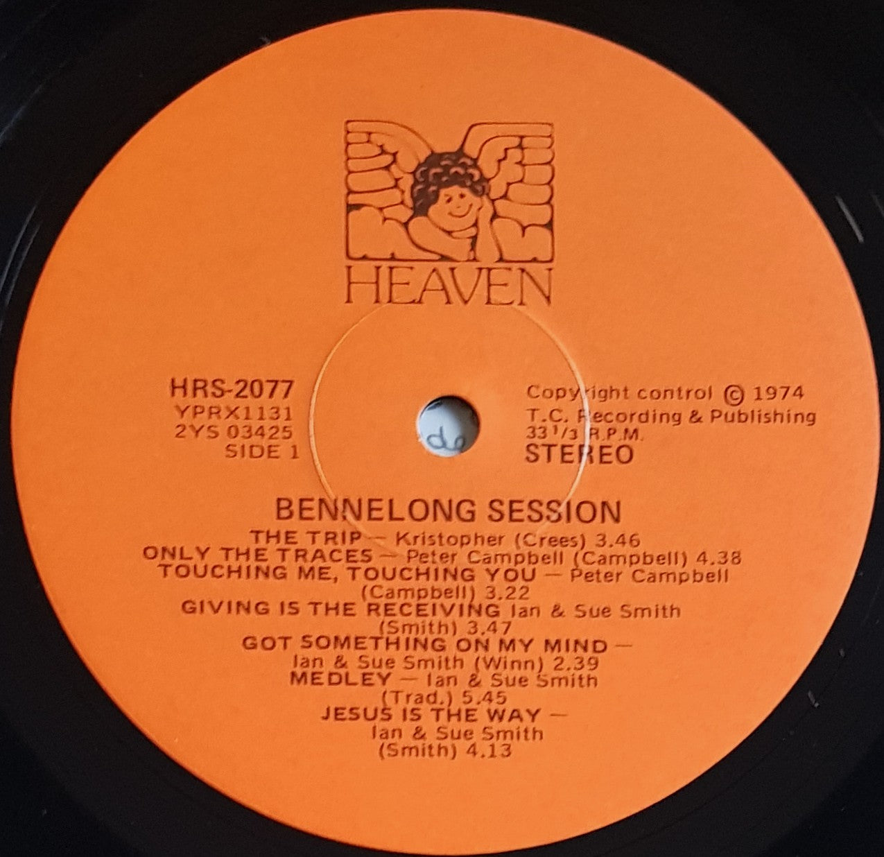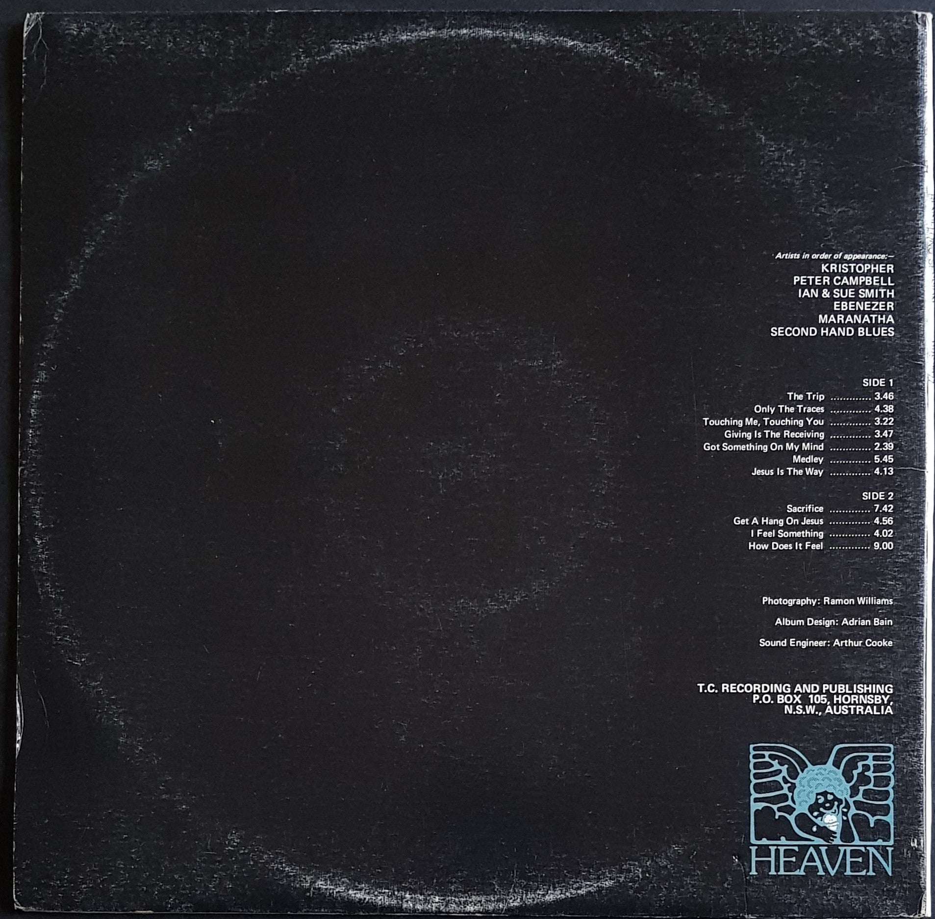 Gatefold Cover w.Insert. 1974 Heaven HRS 2077. Features Tracks by Peter Campbell, Ebenezer, Ian & Sue Smith, Second Hand Blues, Maranatha & Kristopher. Front cover has minor ring wear. Back cover has heavier ring wear and looks closer to VG. Inside the gatefold is EX.
