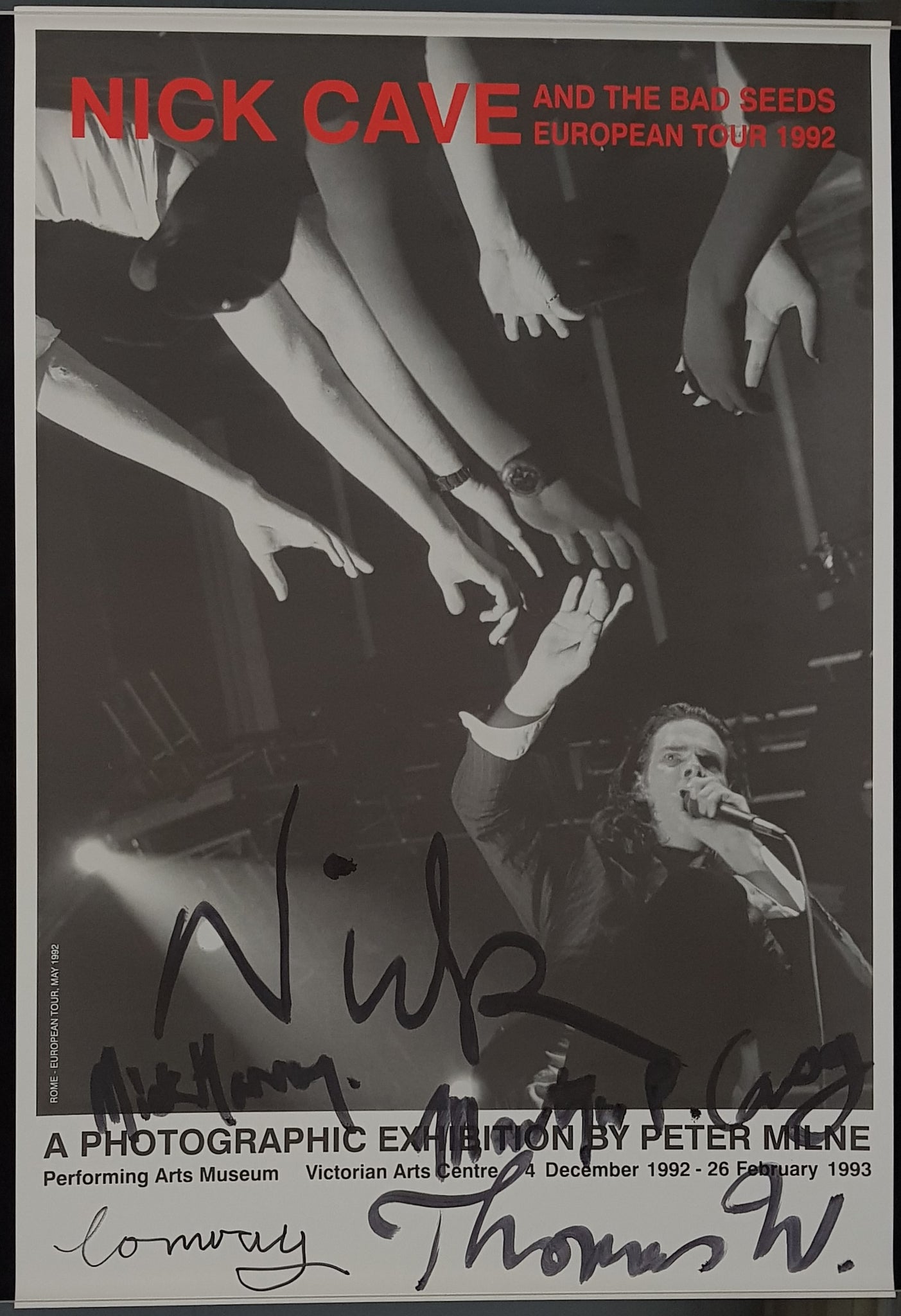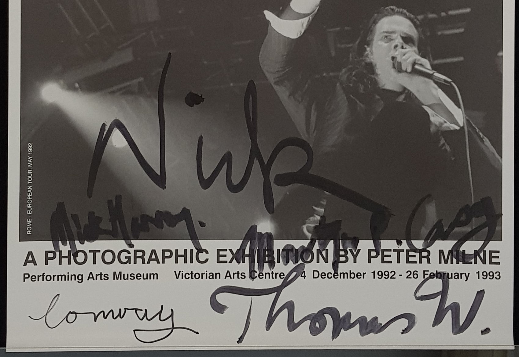 For Exhibit Of Peter's Pictures Taken During the 1992 European Tour. Held at the Performing Arts Museum Dec. 1992 - Feb.1993. 40cm x 59cm. Signed by Nick Cave, Mick Harvey, Conway Savage, Thomas Wylder, Martyn Casey.