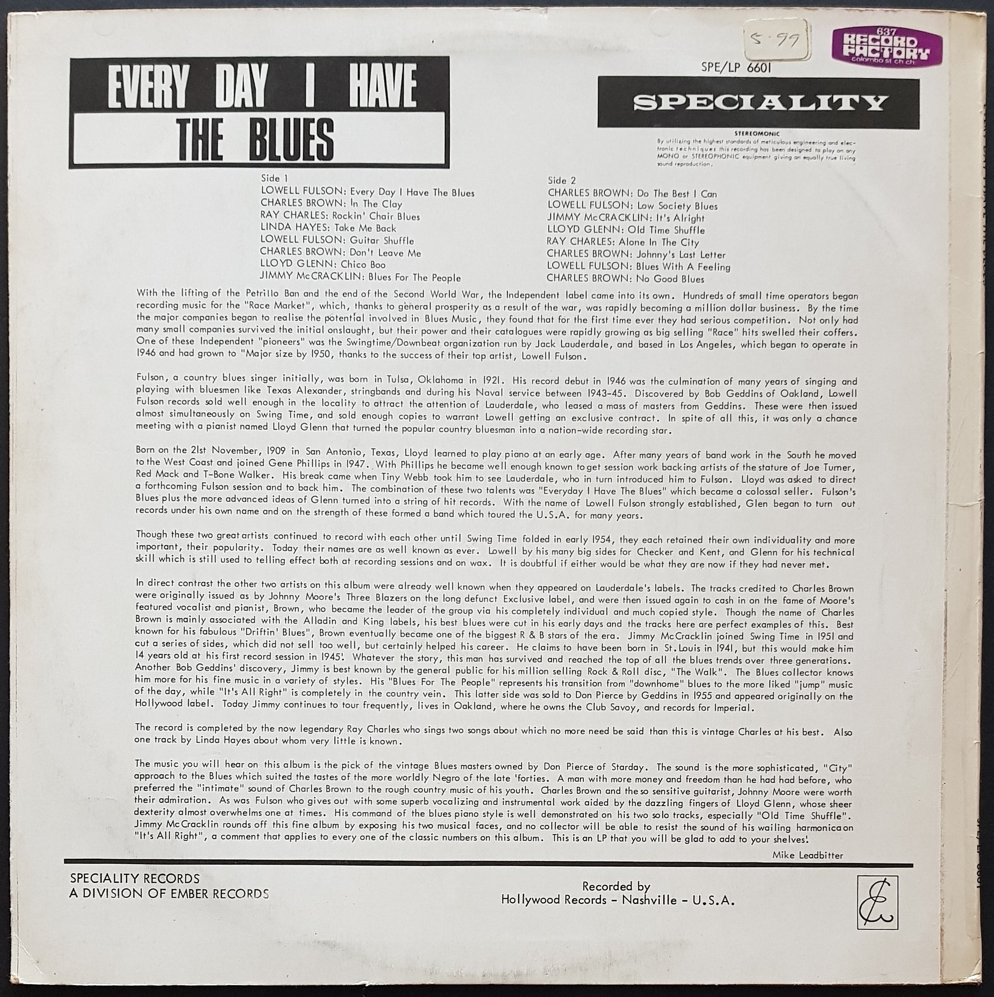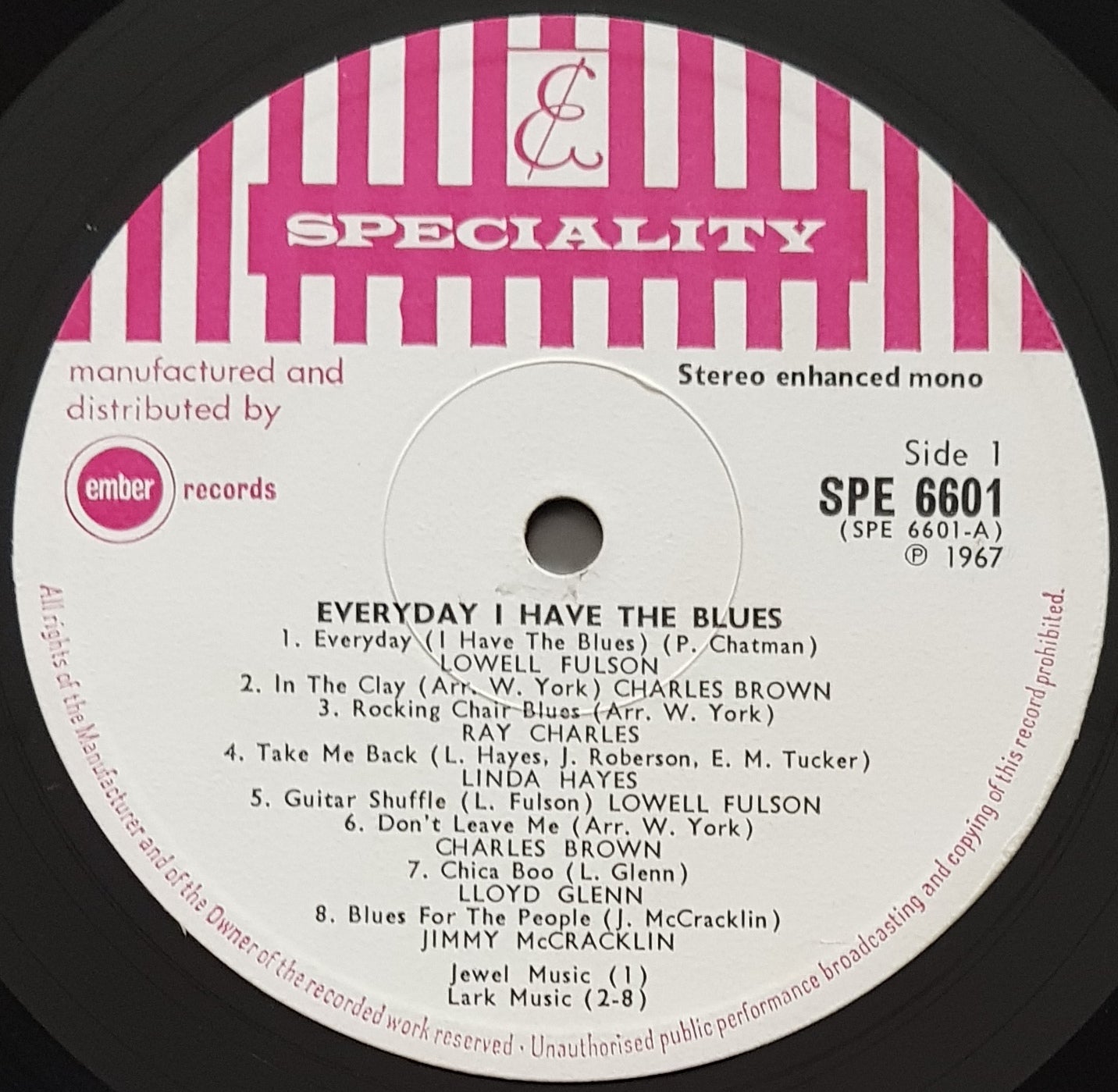 1967 Ember Records SPE 6601. Featreus tracks by Lowell Fulson, Charles Brown, Ray Charles, Lloyd Glenn, Jimmy McCracklin & Linda Hayes. Cover has minor damage at opening and handling creases on front.