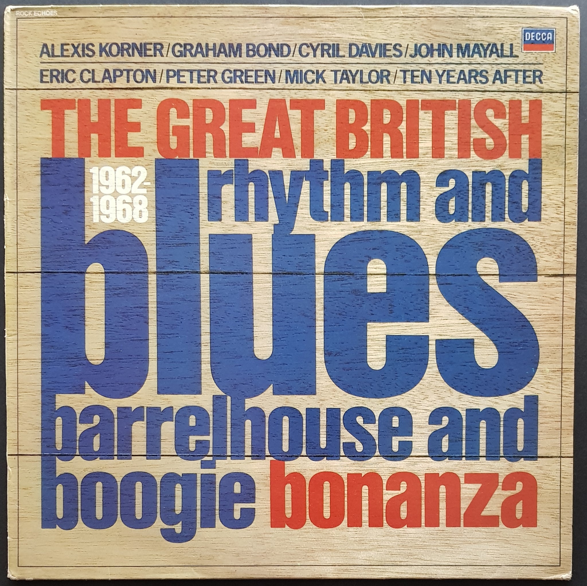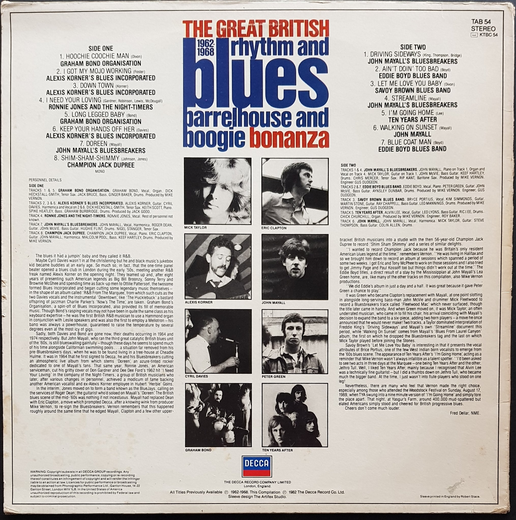 Classics From 1962-1968. 1982 Decca TAB 54. Features Graham Bond Organisation, Alexis Korner's Blues Incorporated, John Mayall's Bluesbreakers + Others. Cover has corner crease and wear along spine and foxing on rear.