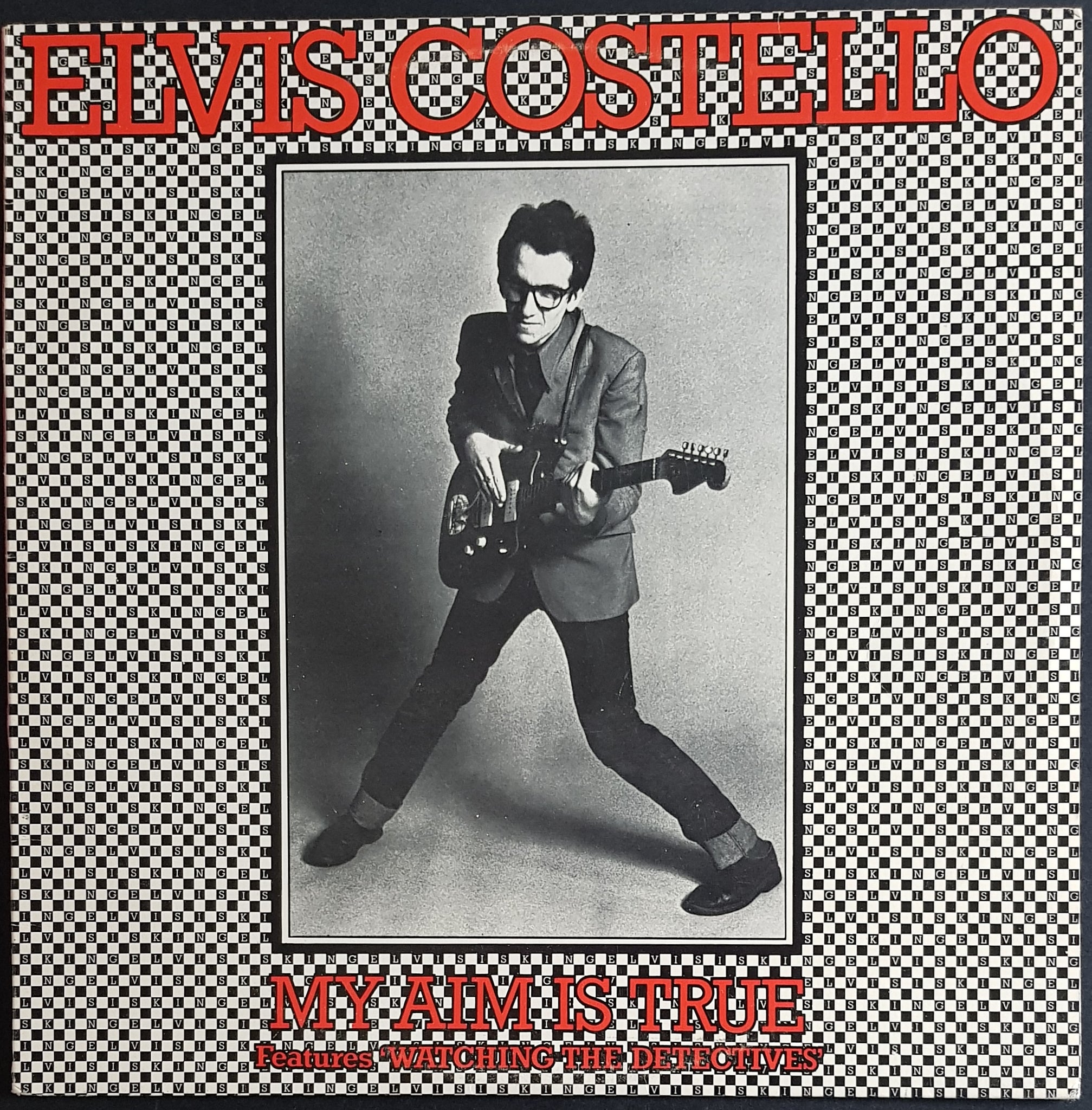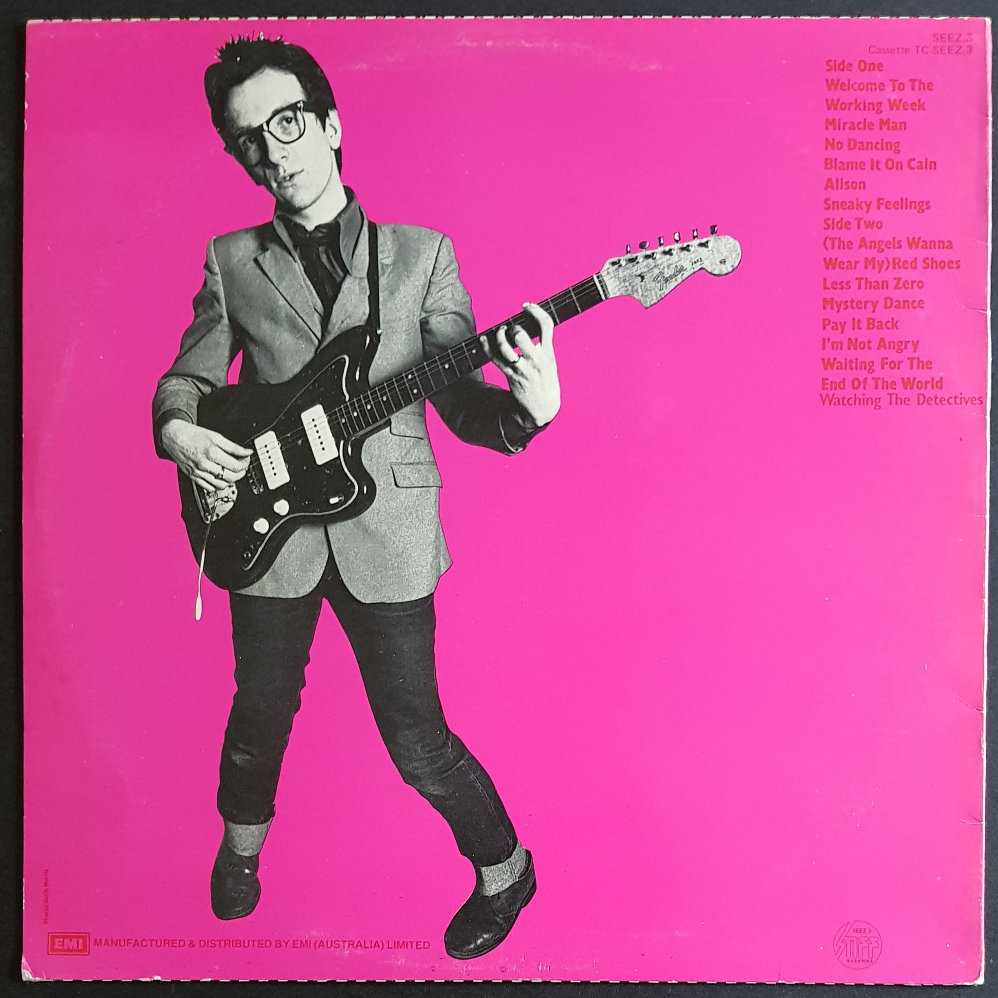 1977 EMI / STIFF Issue. SEEZ-3. Pink Back Cover. Featuring Watching The Detectives in Red Text at Bottom Of Cover. Minor ring wear and small stain spots on back cover. Minor scuffs on disc