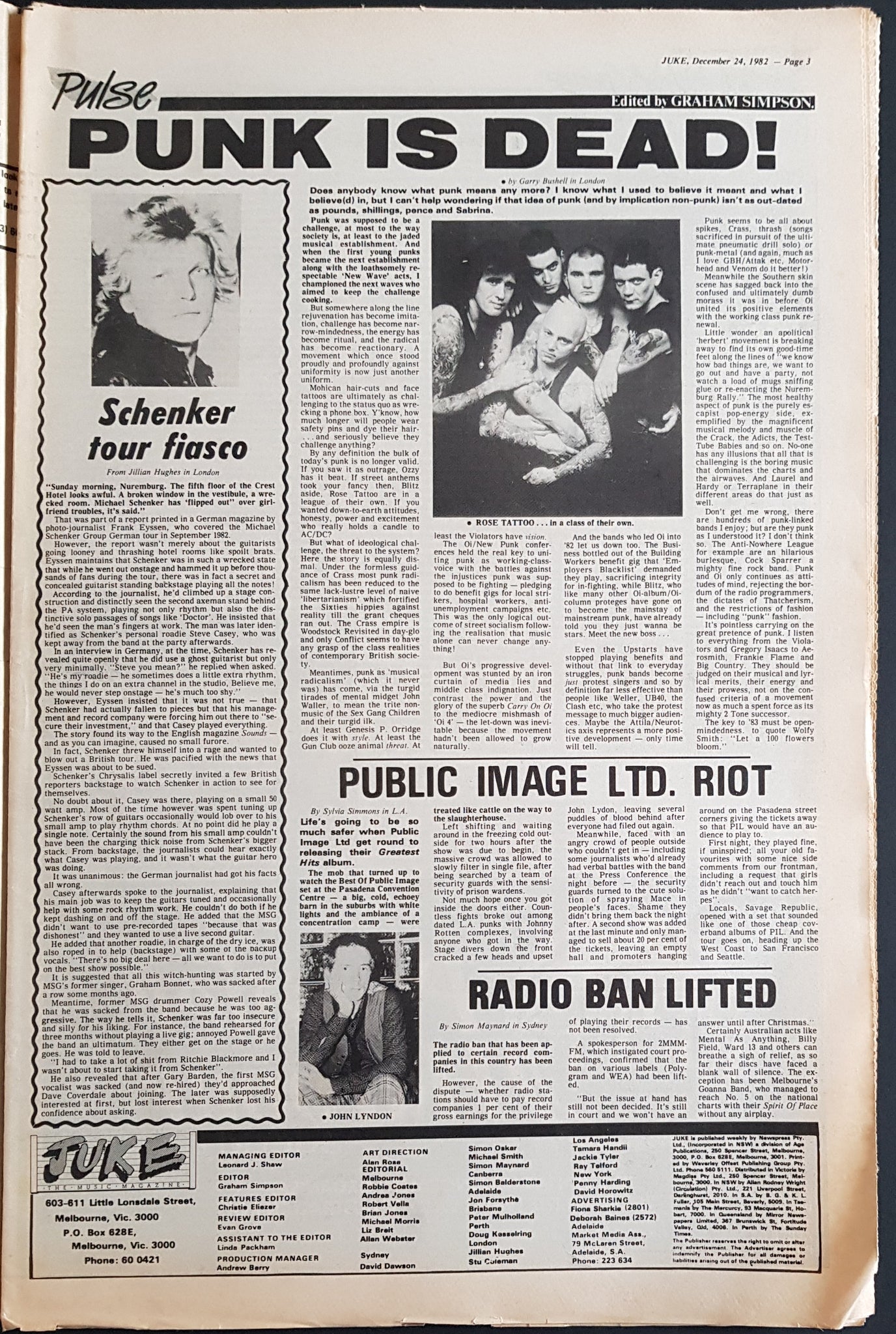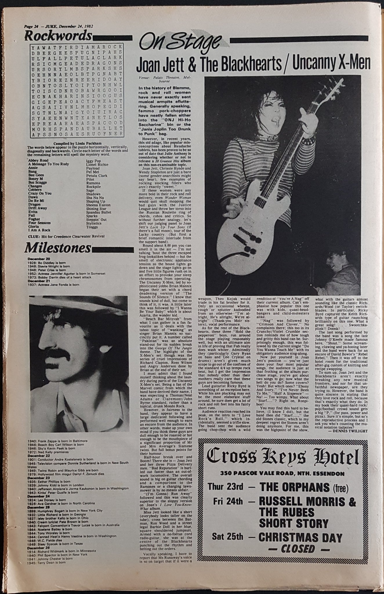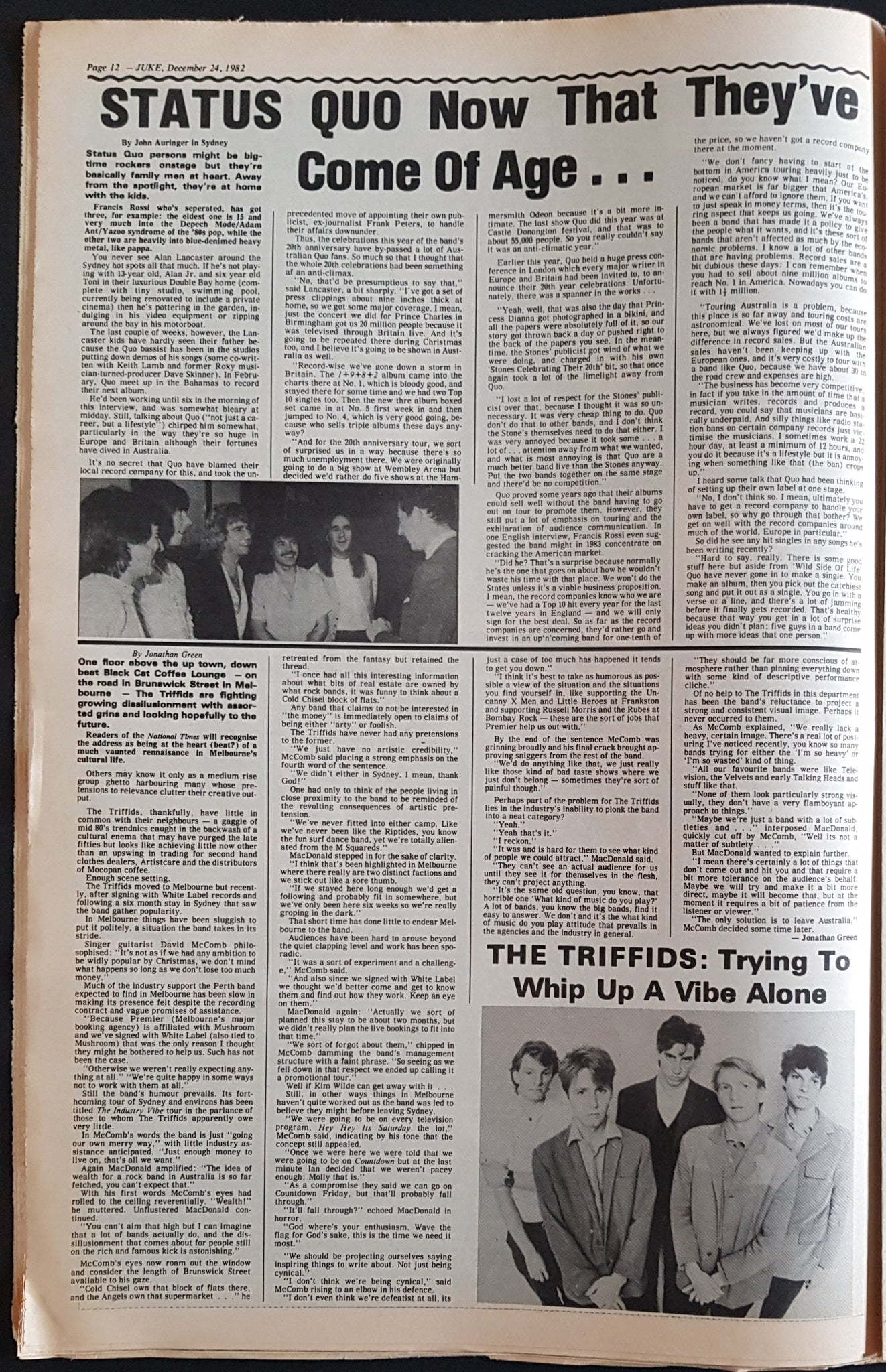 w. C.C Cover & Article. Issue Also Features, Reviews And Or Has Ads on Rose Tattoo, Triffids, Status Quo, Ritchie Blackmore, Joan Jett, Narara'83 Ad + Others.