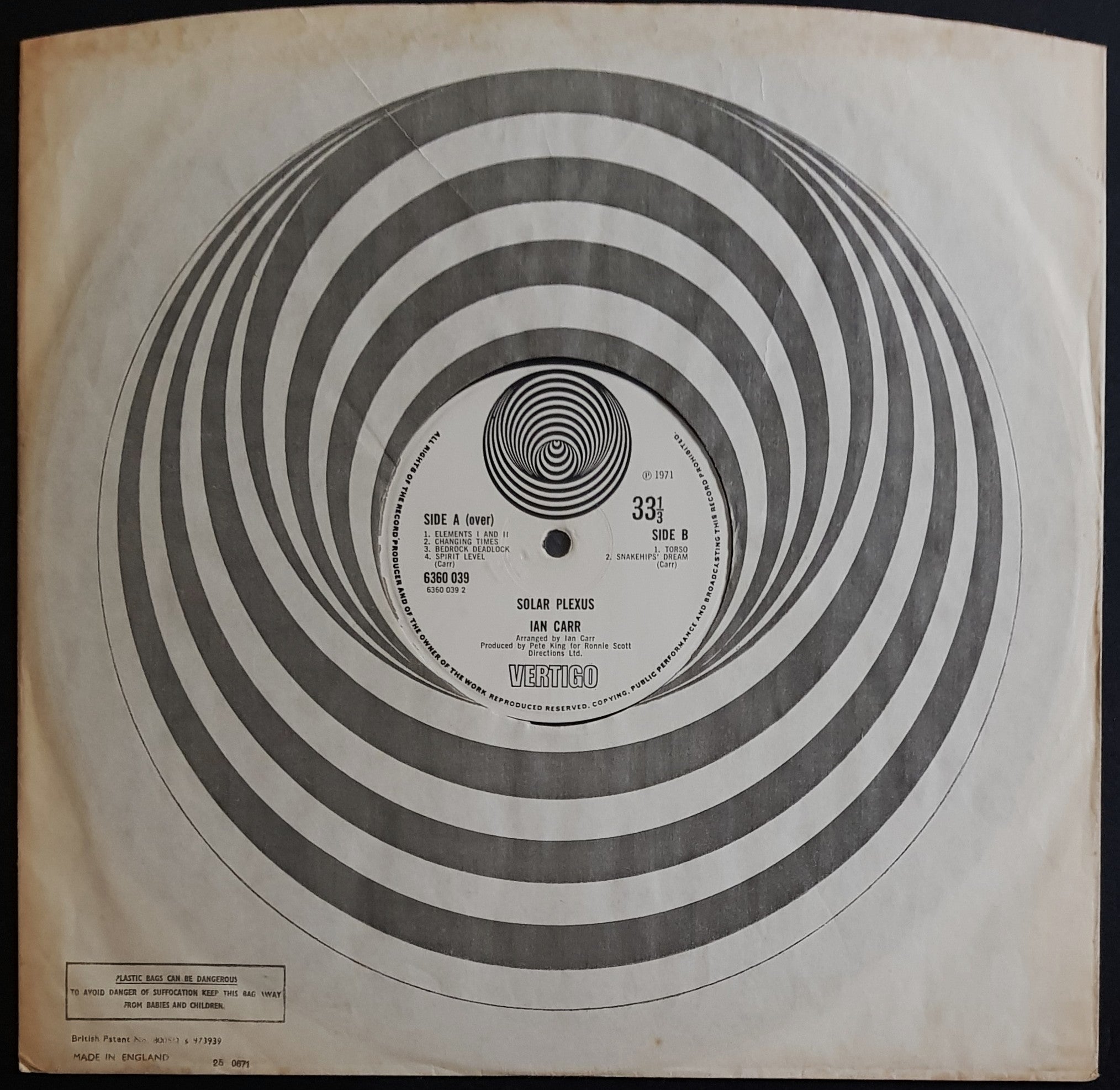Gatefold Cover w.Spiral Inner Sleeve (has foxing). 1971 Vertigo 6360 039. Cover has surface, edge & corner wear. Tiny surface tear on rear. No splits. Record is very clean with spindle marks on labels.