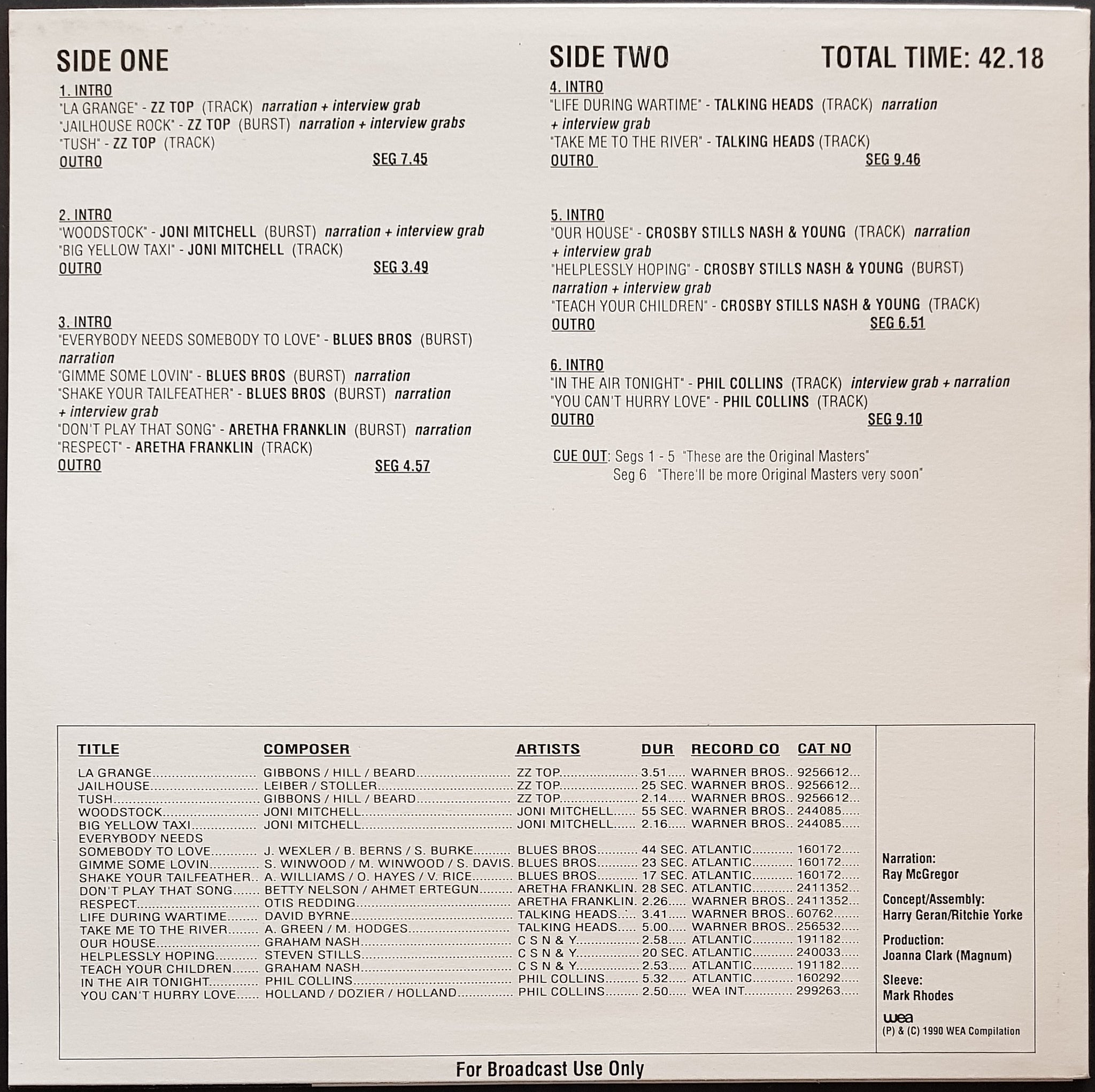 Broadcast only LP w.6m.51s. Segment on C,S,N&Y. Features segments on ZZ Top, Joni Mitchell, Aretha Franklin, Blues Bros., Talking Heads & Phil Collins. 1990 WEA R-2.