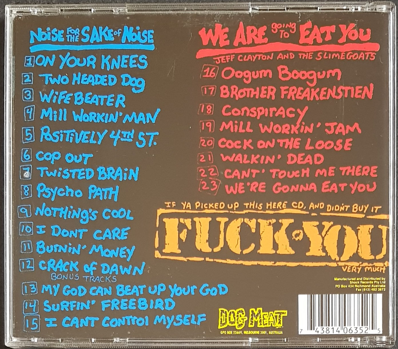 1989 Dog Meat DOG 035CD. w.8 Jeff Clayton And The Slimegoats Tracks. Front Cover Insert Has Minor Crease and Lug Mark From Jewel Case.