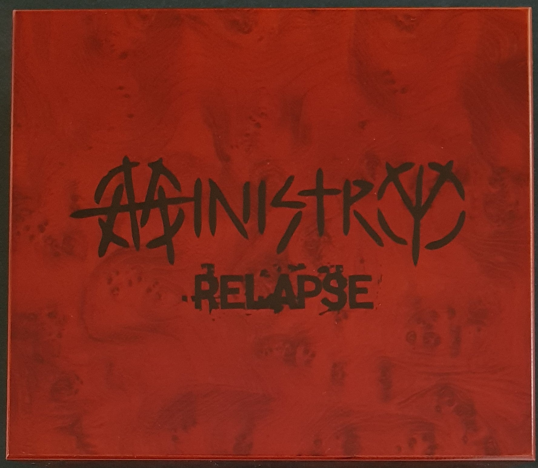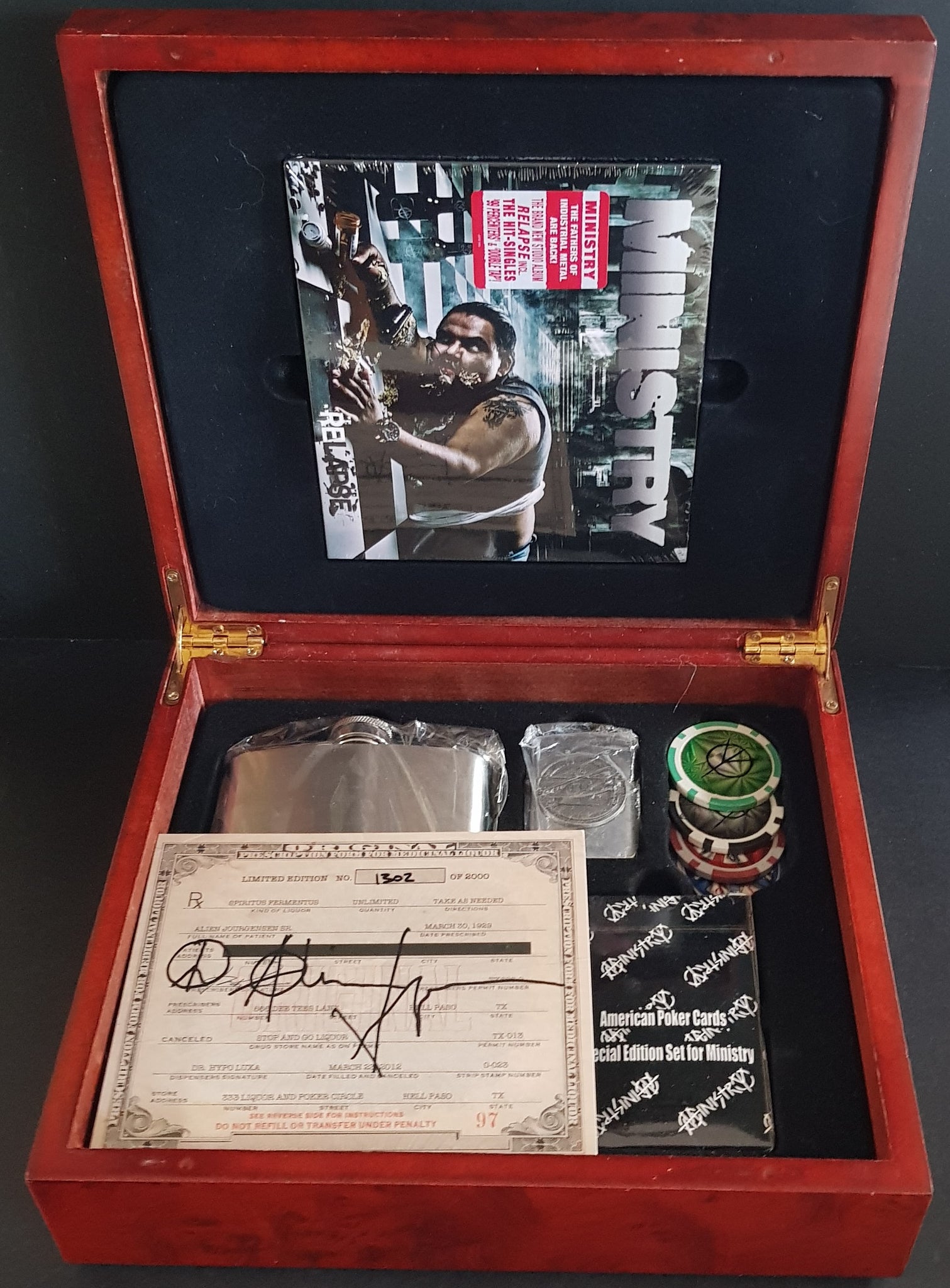 Elaborate Wooden Box Set Complete w. a poker set (1 pack of cards, 4 poker chips), 1 lighter, 1 flask with embossed Ministry logo, "Relapse" album in limited digipak edition & a certificate, #1302. 2012 AFM Records AFM 399-6.