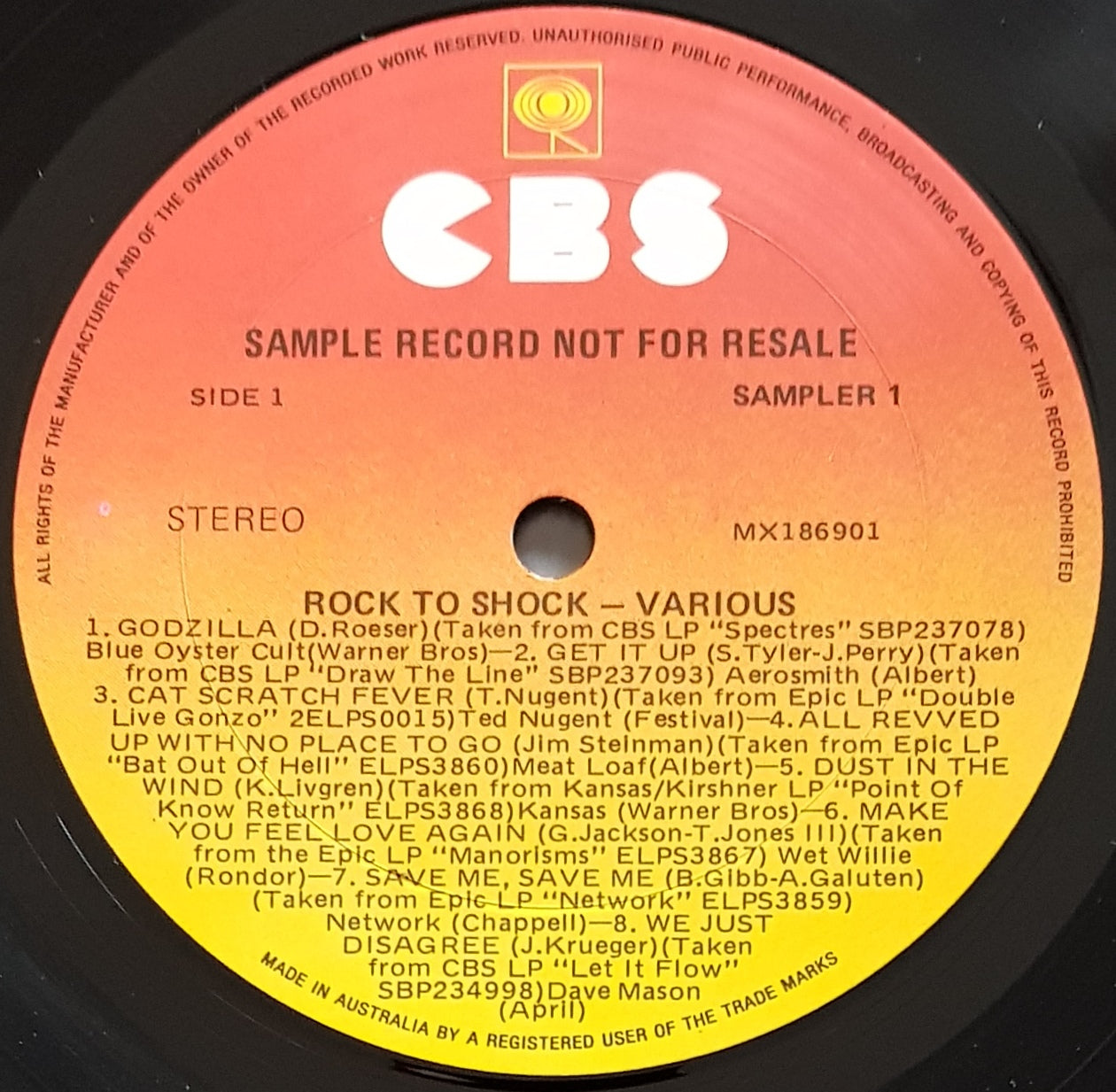 Promo Only Sampler form late 1970's. CBS SAMPLER 1. Features Finch, Vibrators, Cheap Trick, Aerosmith, Blue Oyster Cult & Ted Nugent. With Ted Nugent Cover. Cover Has Minor Seam Split.