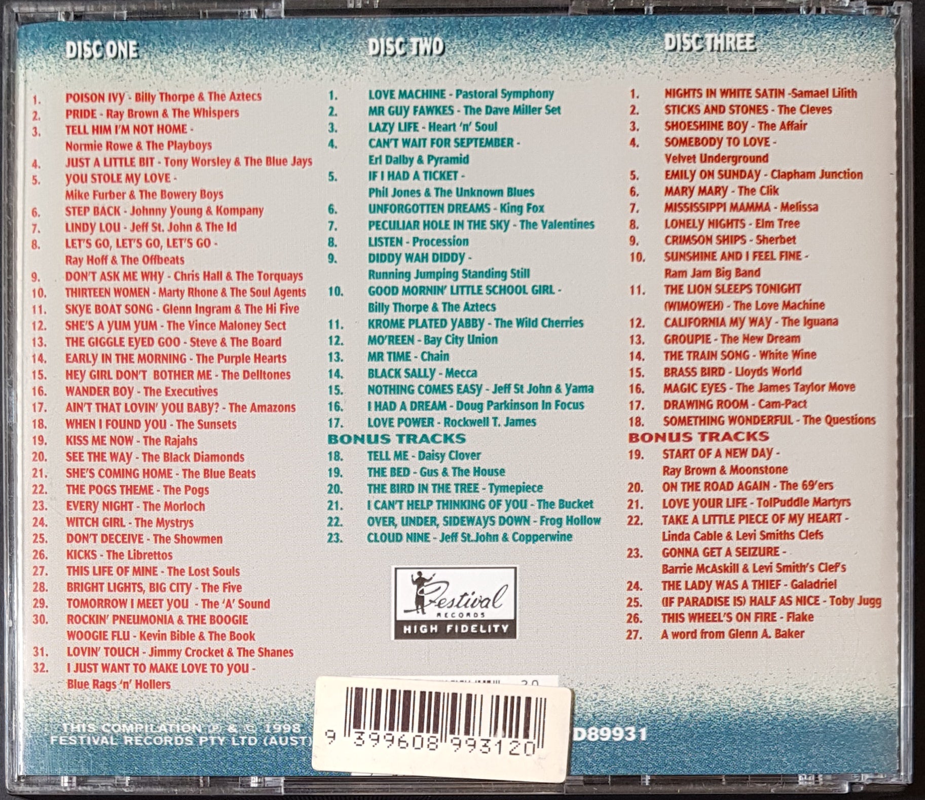 Great Compilation Of Aus.60's Tracks. This Set Is Remastered & Features 15 Bonus Tracks. 1998 Spin / Festival Records D89931. LONG DELETED