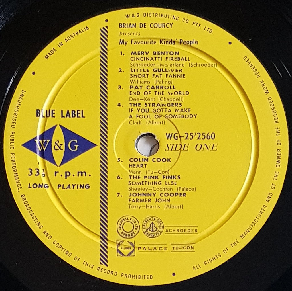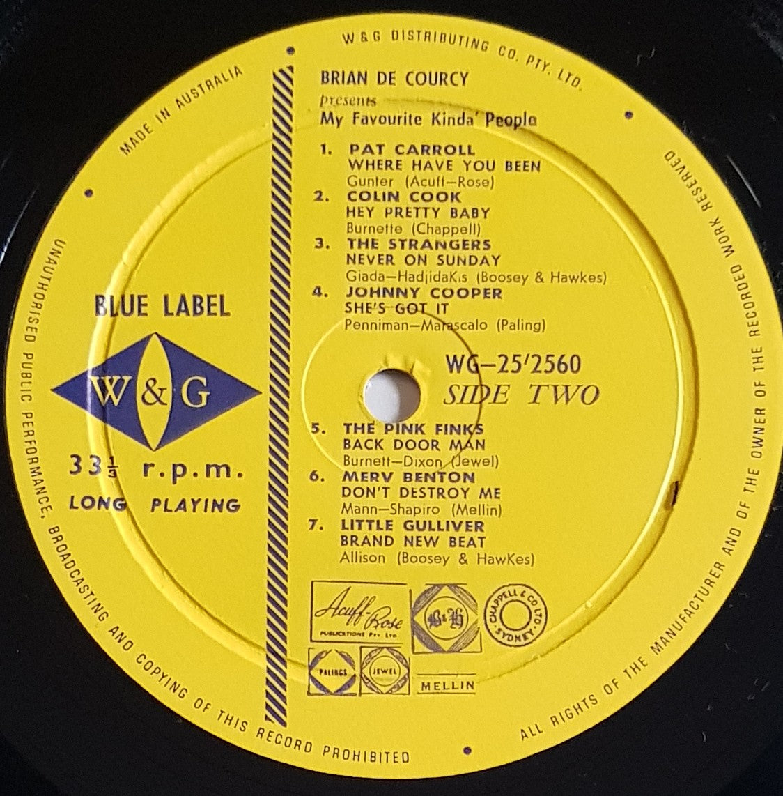 Compilation. 1965 Original W&G Label WG-25/2560. Features Pink Finks, Little Gulliver, Stranglers, Merv Benton, Colin Cook & Pat Carroll. Minor wear, foxing and small crease on cover.