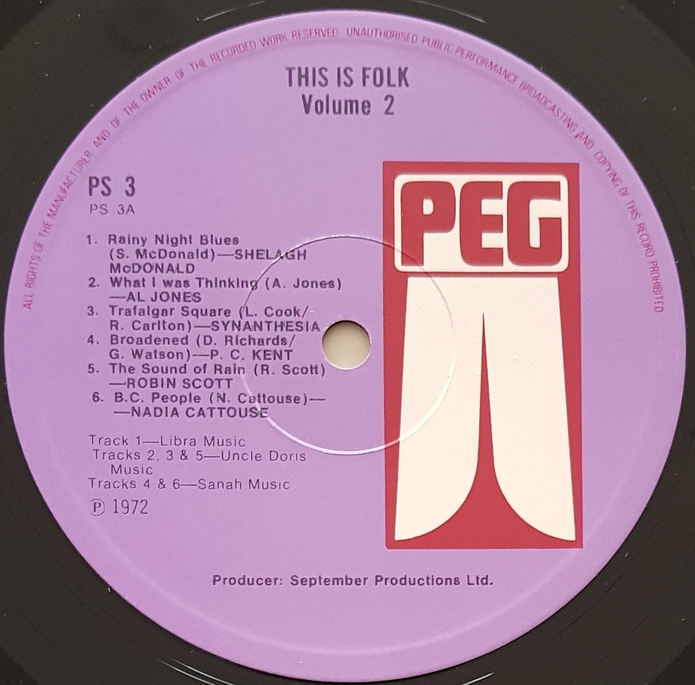 1972 PEG Label PS3. Compilation Featuring Robin Scott. Small Surface Tear On Cover & 1" Seam Split.