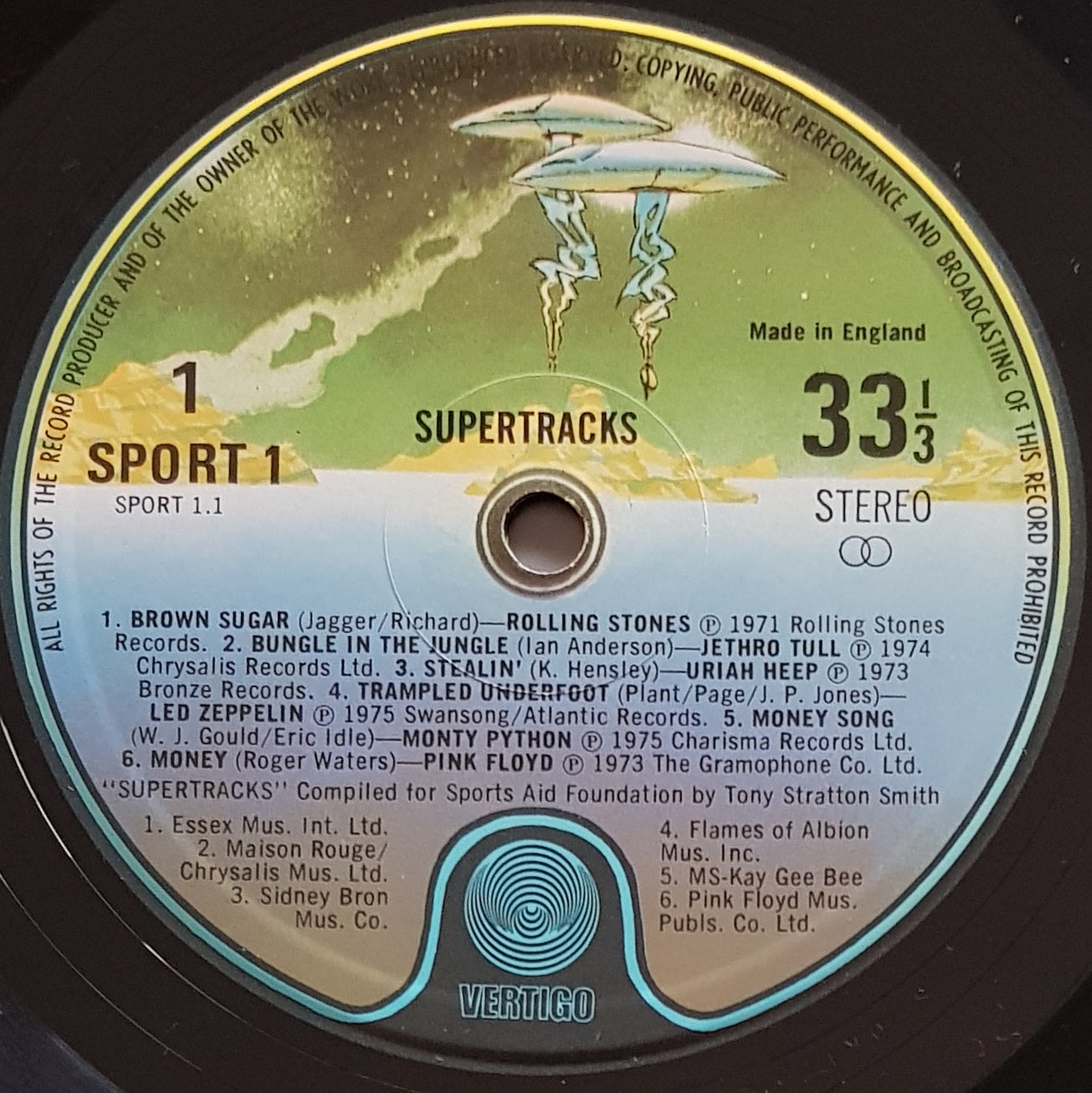 1976 VERTIGO Label SPORT1. Features Tracks By Led Zeppelin, Pink Floyd, Rolling Stones, Yes, Genesis, Rod Stewart, Jethro Tull & Uriah Heep. Minor Surface Wear & Scratch on Cover. Light Scuffs & Hairline Marks on Disc