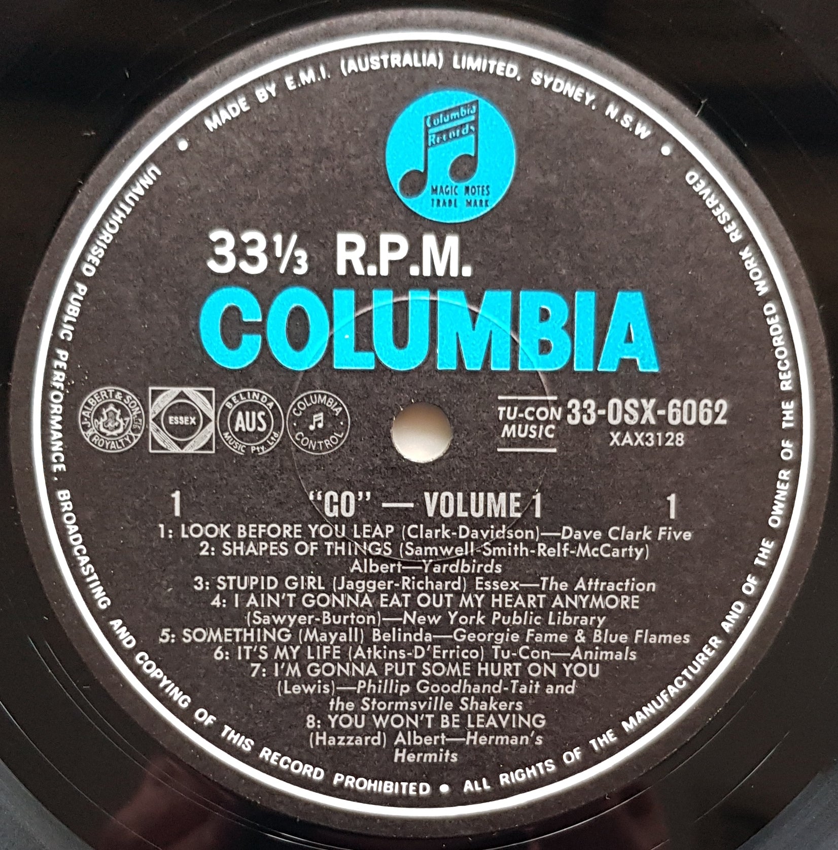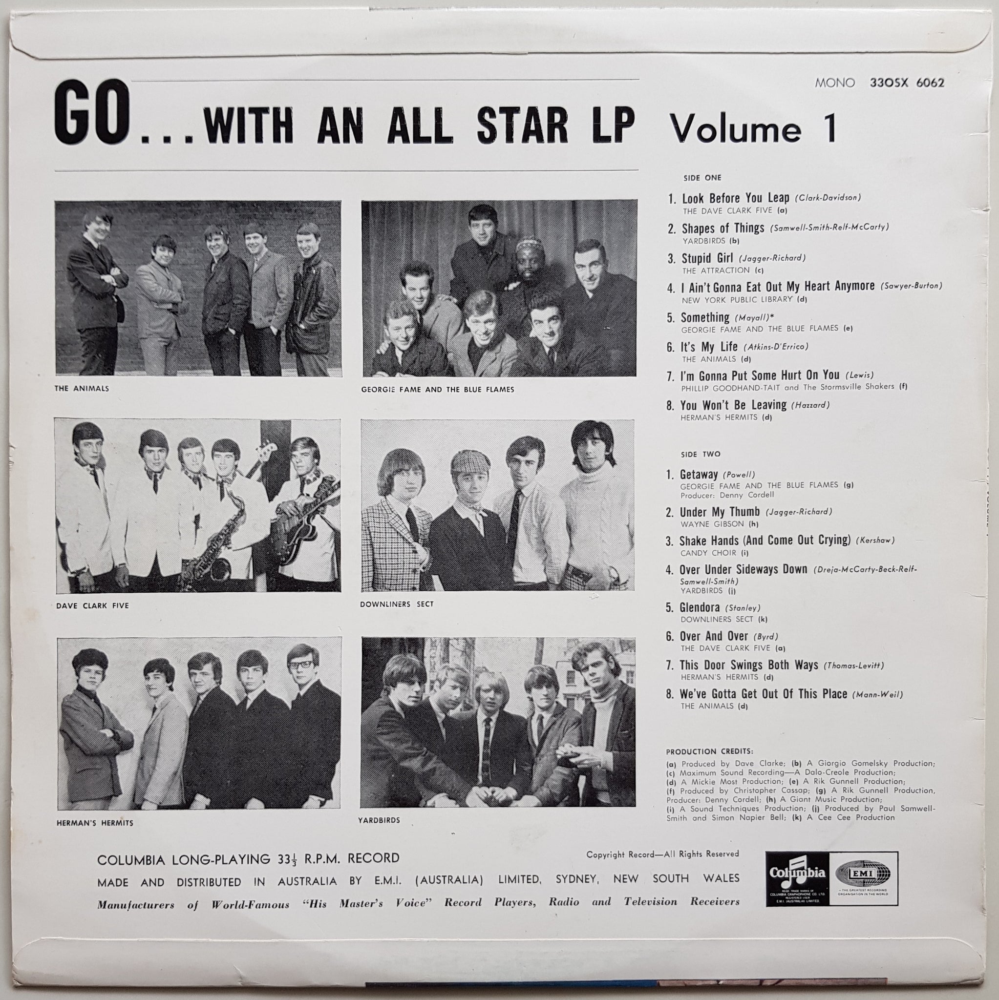 Late 60's Compilation. MONO. Incredibly Rare! Columbia 33OSX 6062. Featured tracks by The Yardbirds, Dave Clark Five, Georgie Fame & The Blue Flames, The Animals, Herman's Hermits, Downliners Sect + Others. Soft cover has minor indentation of record rim, small sticker and 3 small sticker stains on front. Record is Brilliant with one tiny scuff mark.