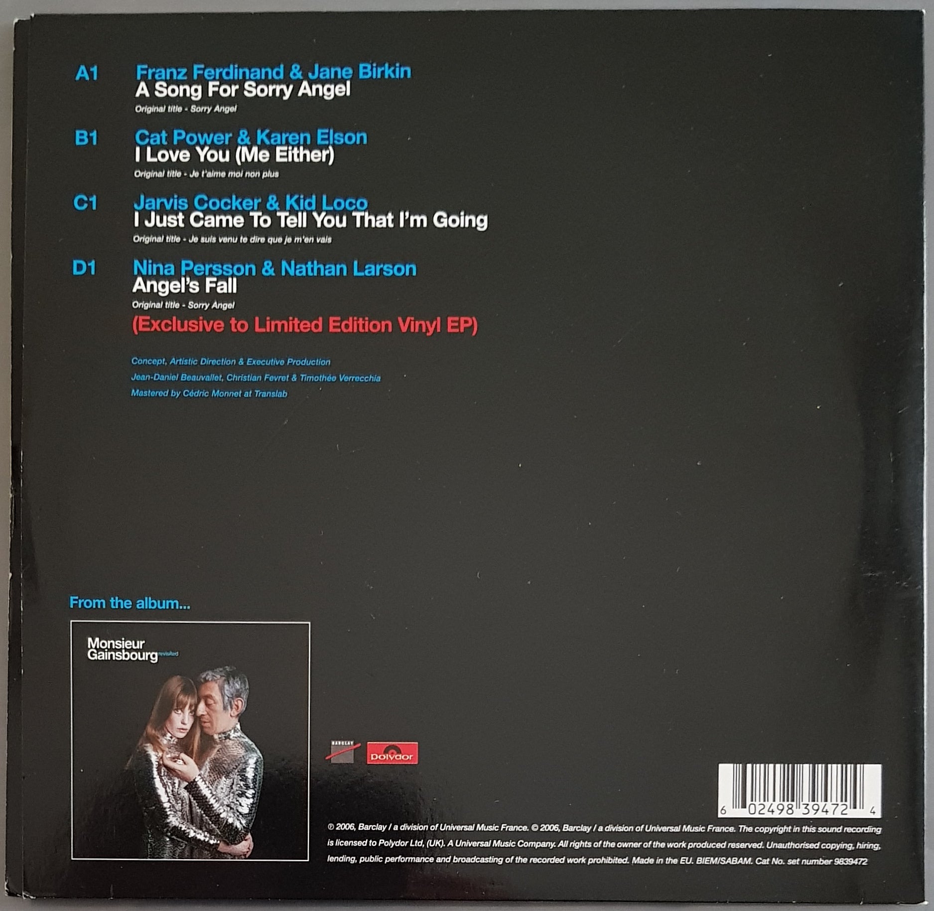 x 2 Gatefold PS. 2006 Barclay 9839472. Features Franz Ferdinand & Jane Birkin, Cat Power & Karen Elson, Jarvis Cocker & Kid Loco, Nina Persson & Nathan Larson Covering Classics w.One Track Only Available on This Release. Disc 1 is EX, Disc 2 has small / fine marks on both sides that will tick, apart from that the disc is clean. Small scratch mark on back cover.