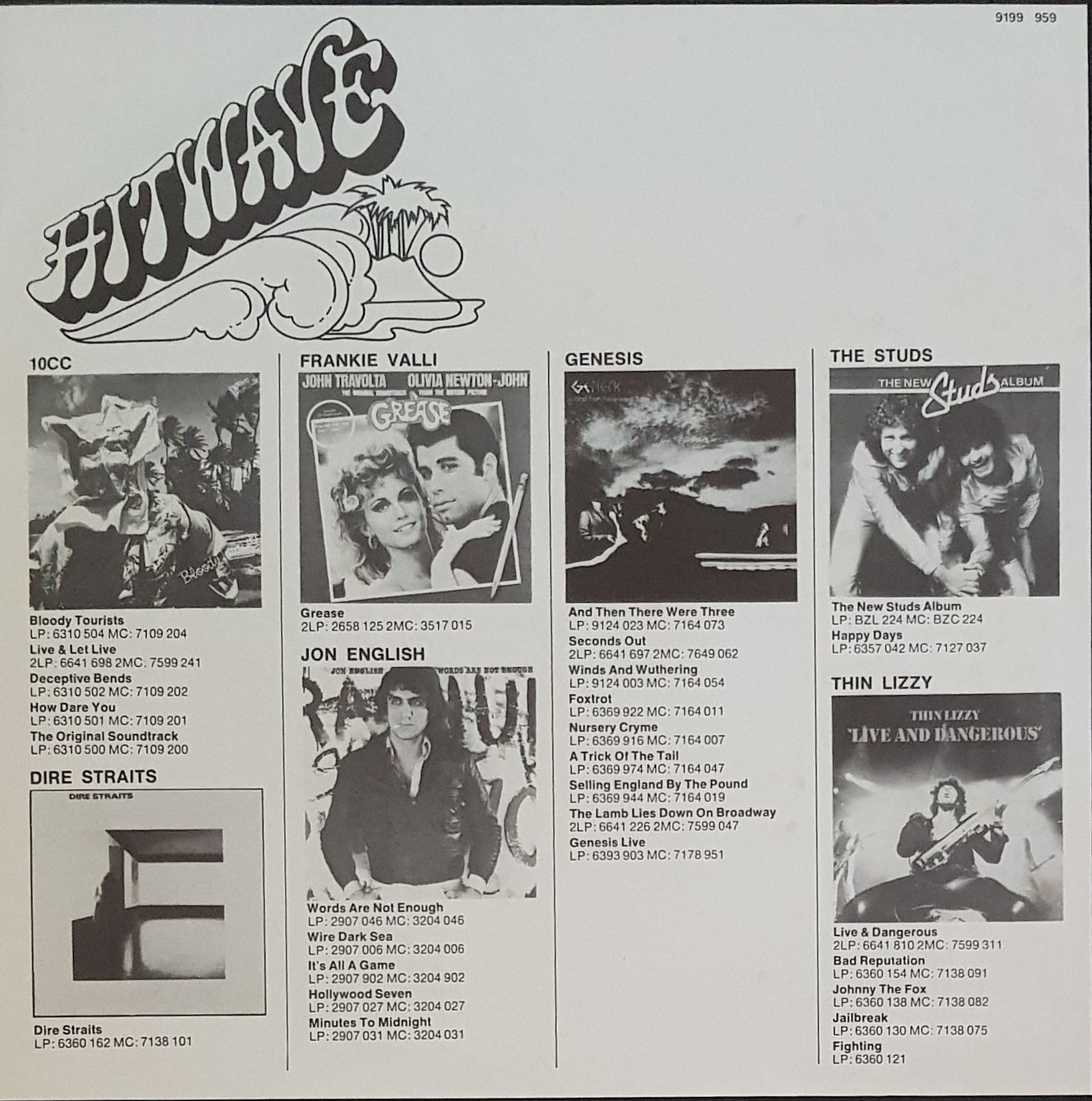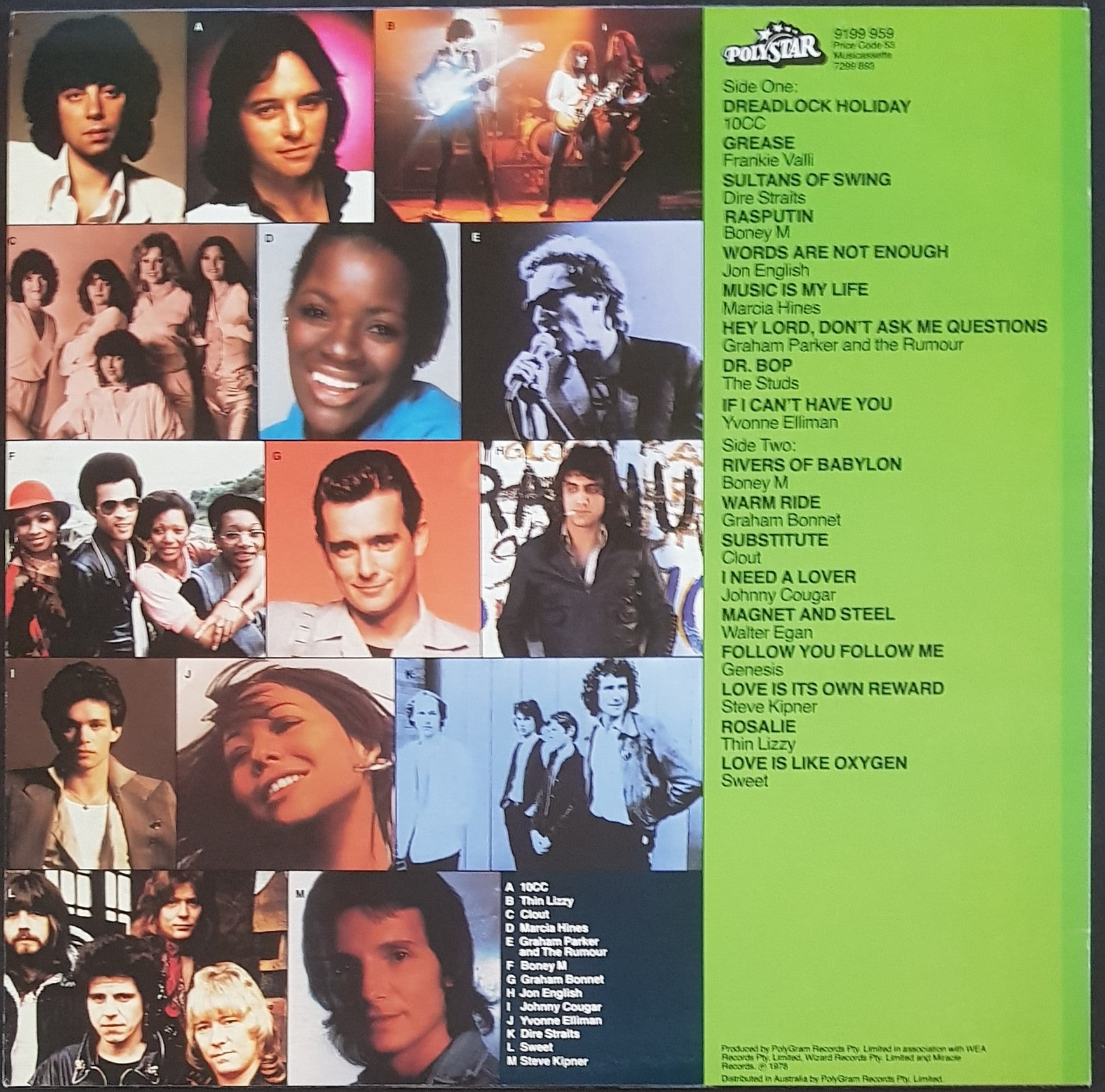 Green Vinyl w.Insert. 1978 Polystar 9199959. 10CC, Dire Straits, Thin Lizzy, The Sweet, Genesis, Graham Parker. Minor Creases and Wear on Cover. Vinyl has black spots in it.