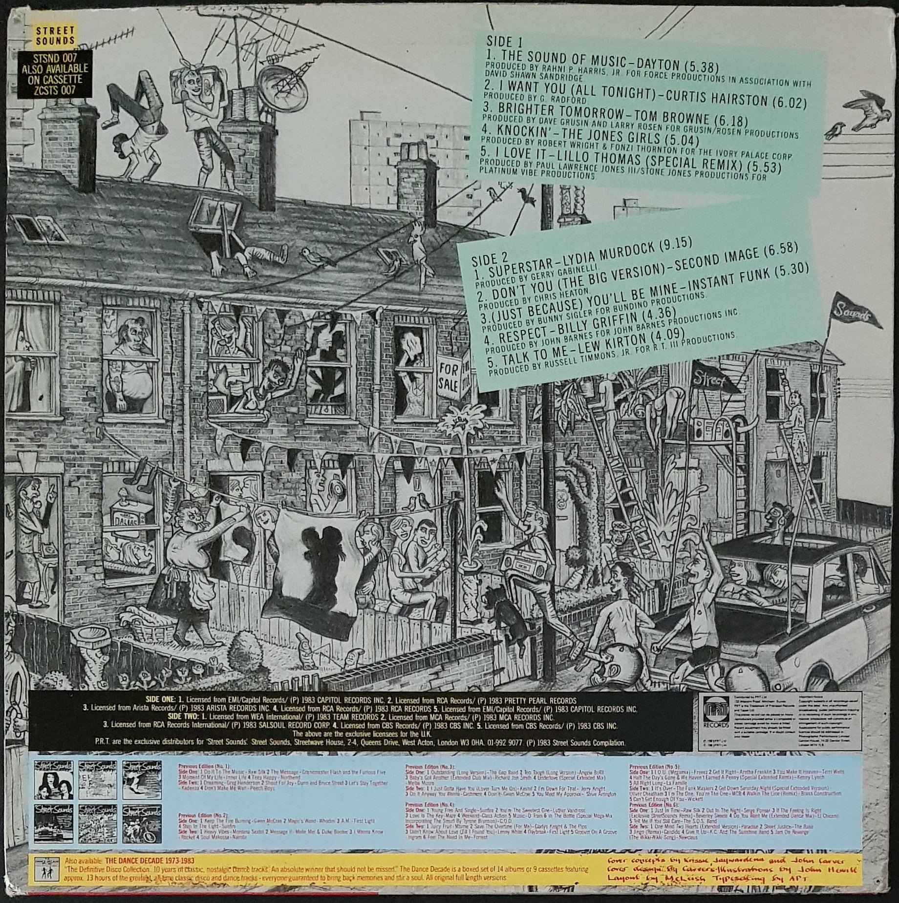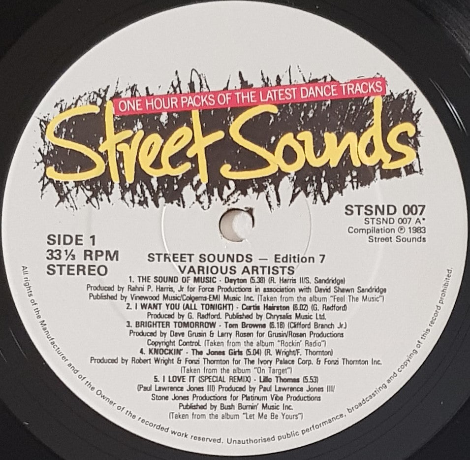 Compilation of Electronic, Funk / Soul, Disco Tracks. 1983 Street Sounds STSND 007. Cover has minor scuffing, handling creases and wear. Light scuffs on disc