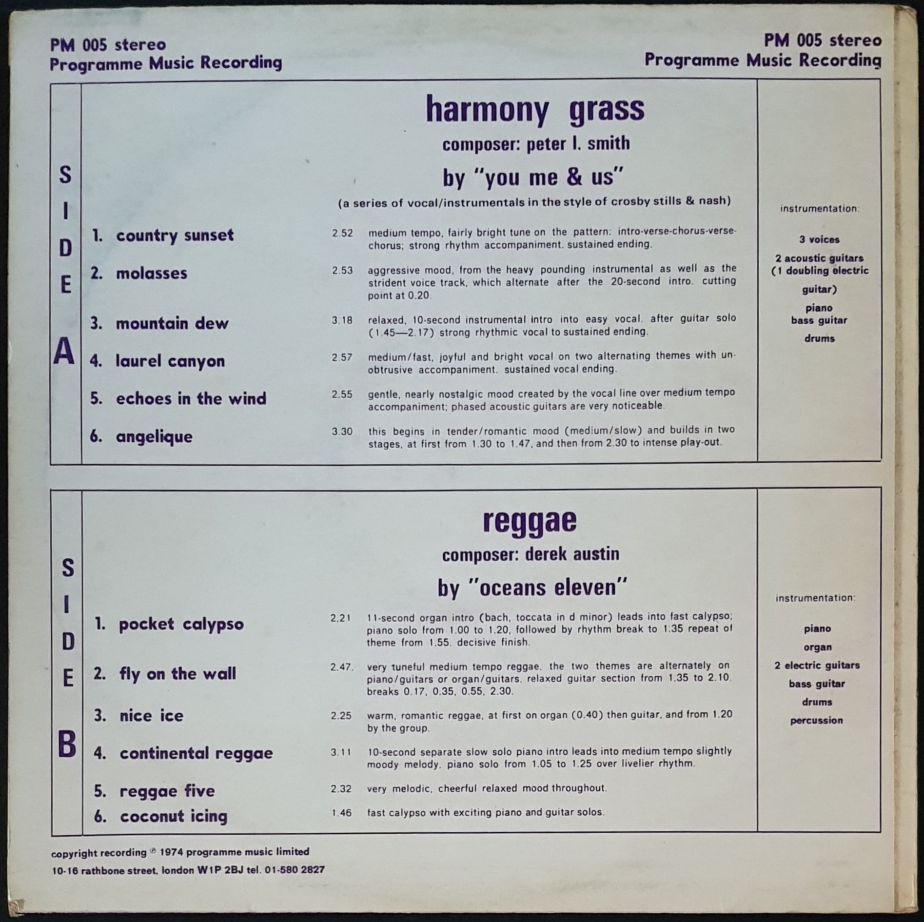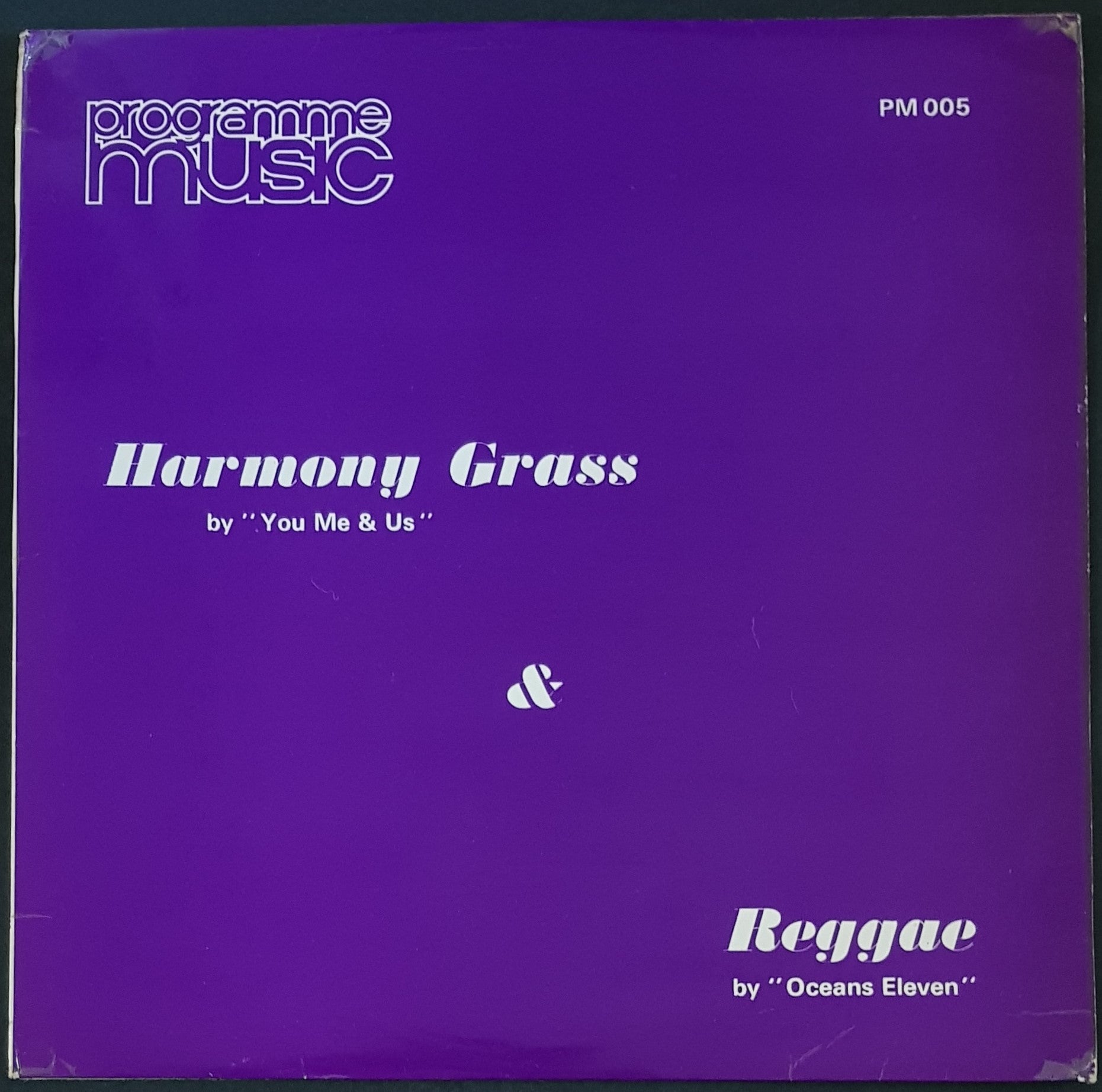 Issued by UK Library label. 1974. Side 1 by You Me & Us, Side 2 by Oceans Eleven (Reggae). Cover has corner wear on all 3 edges, light creases along spine and white panel on rear is a little dirty.