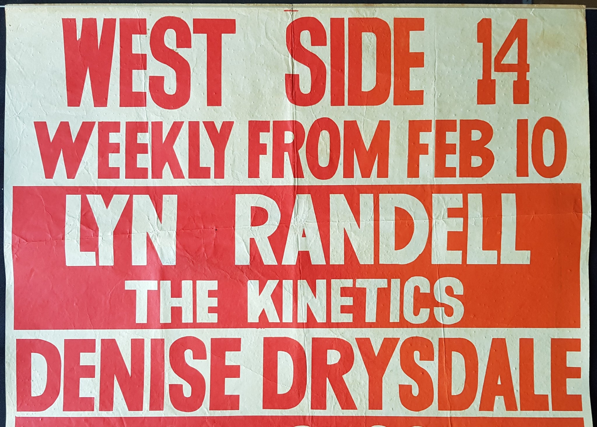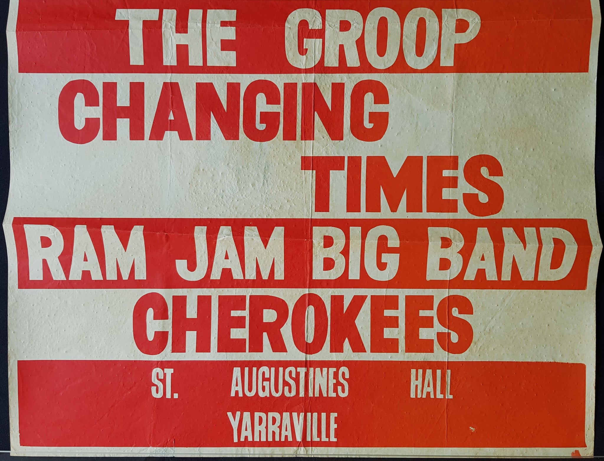 Original Screen Print for Shows Performed At St.Augustines Hall, Yarraville. 50cm x 76cm. Artists Included Lyn Randell (sic), The Kinetics, Denise Drysdale, The Groop, Changing Times, Ram Jam Big Band & Cherokees. Originally removed from a wall has several small pimple like marks on the surface, creases and small spots of paper removal on rear (not holes).