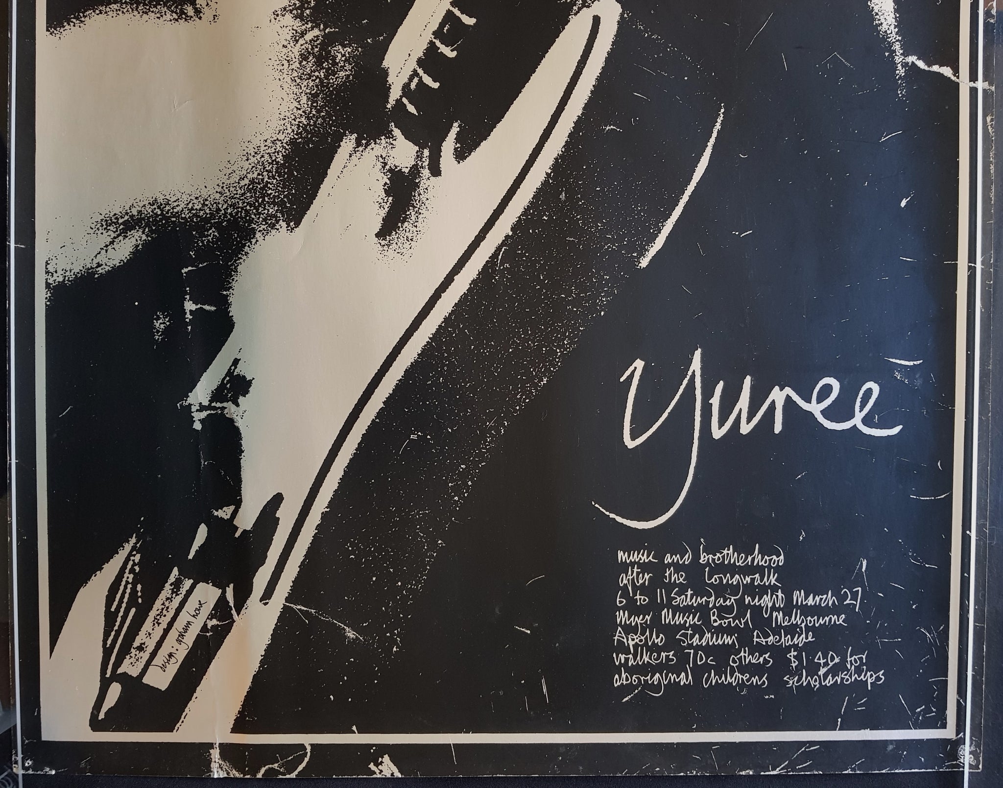Silver Foil Backed Poster w.Black Screen Print. Designed by Graham Howe and used to promote performances at Myer Music Bowl (Melbourne) & Apollo Stadium (Adelaide). Benefit Concert for Secondary Schools Aboriginal Affairs Fund 73cm x 49cm. Daddy Cool, Billy Thorpe & Aztecs, Chain, Healing Force & Spectrum. Minor scuffs and scrapes to print, 2" tear & pin holes in corners.