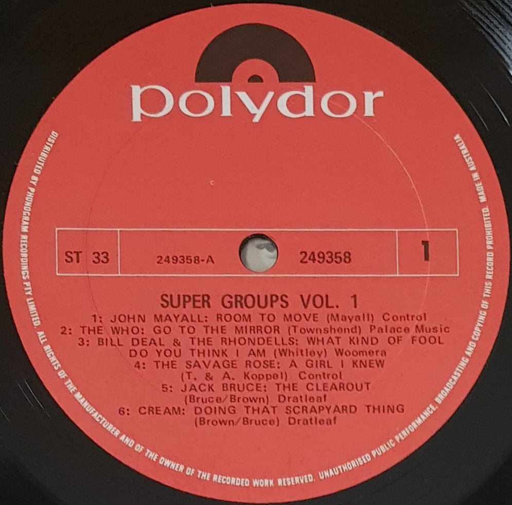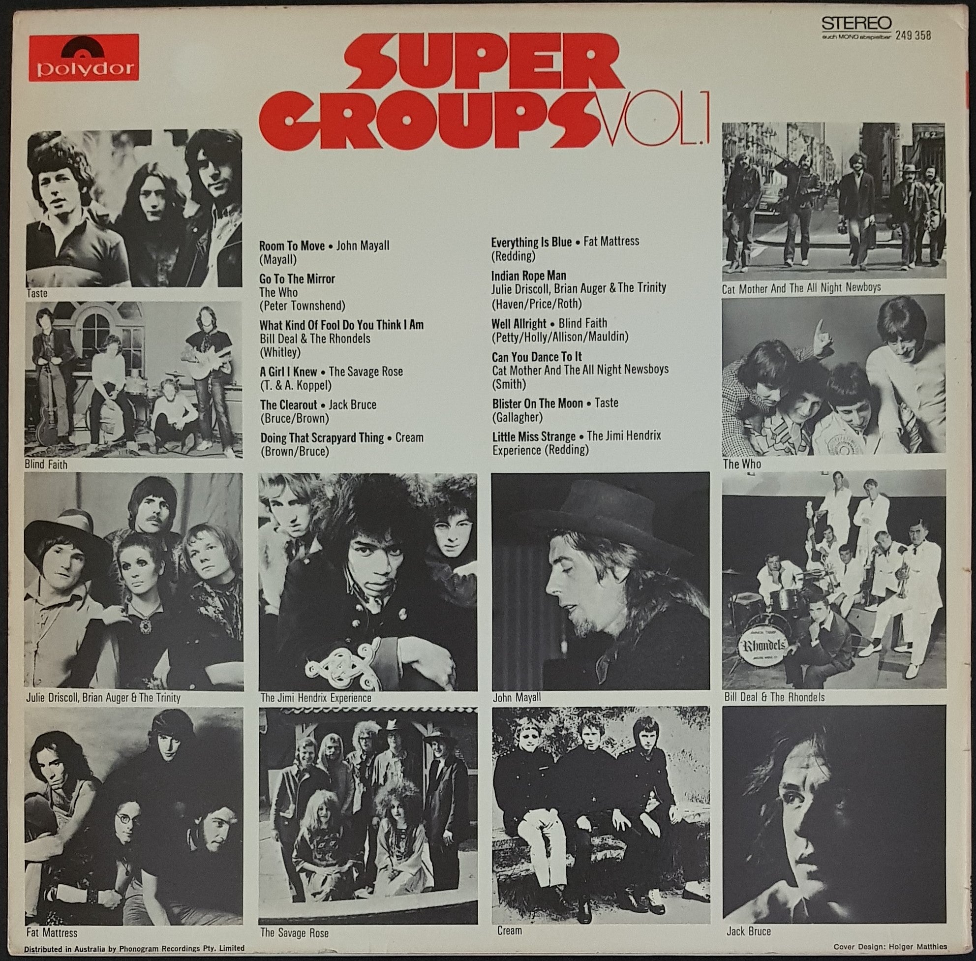 1969 Polydor 249358. John Mayall, The Who, Cream, Cat Mother, Taste, Jimi Hendrix. Heavy scuffing on laminated cover, with creases along spine. Light hairlines on disc