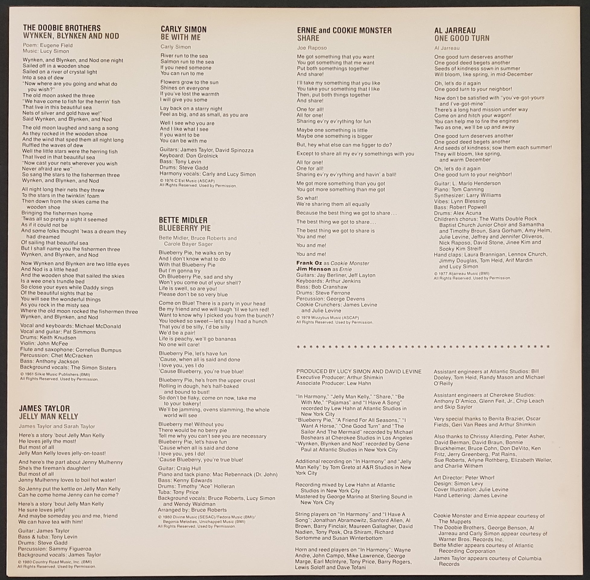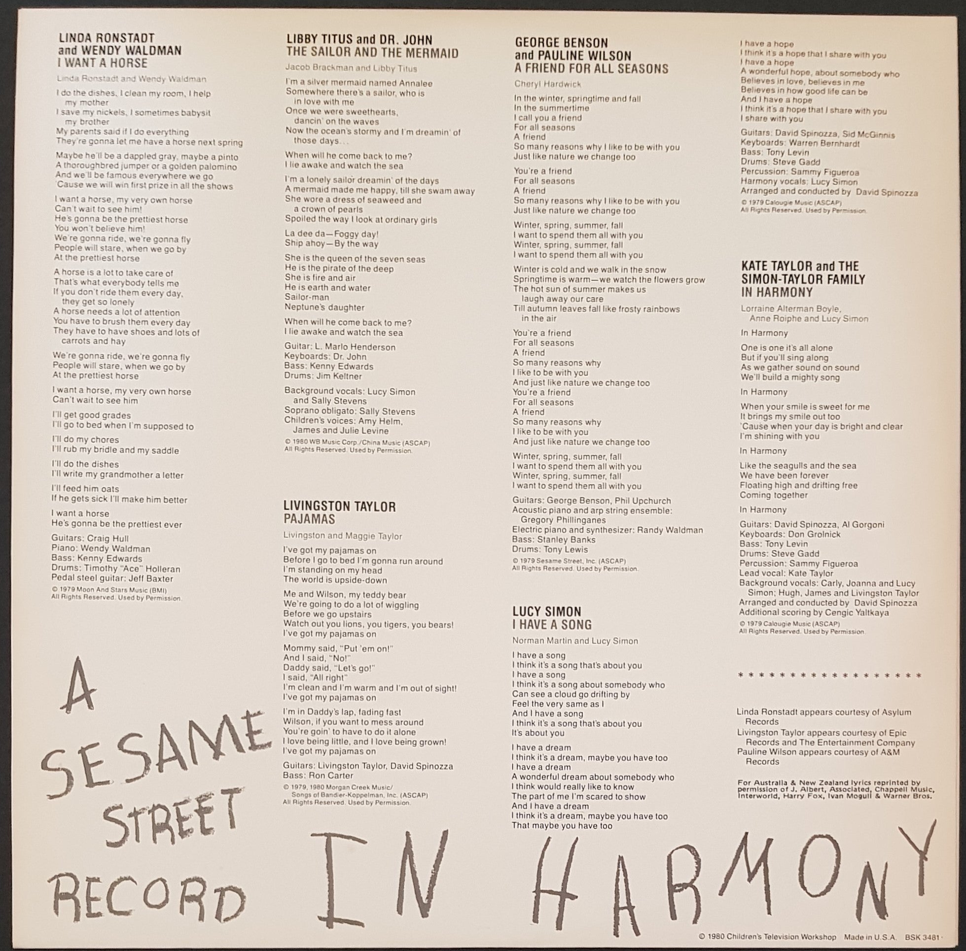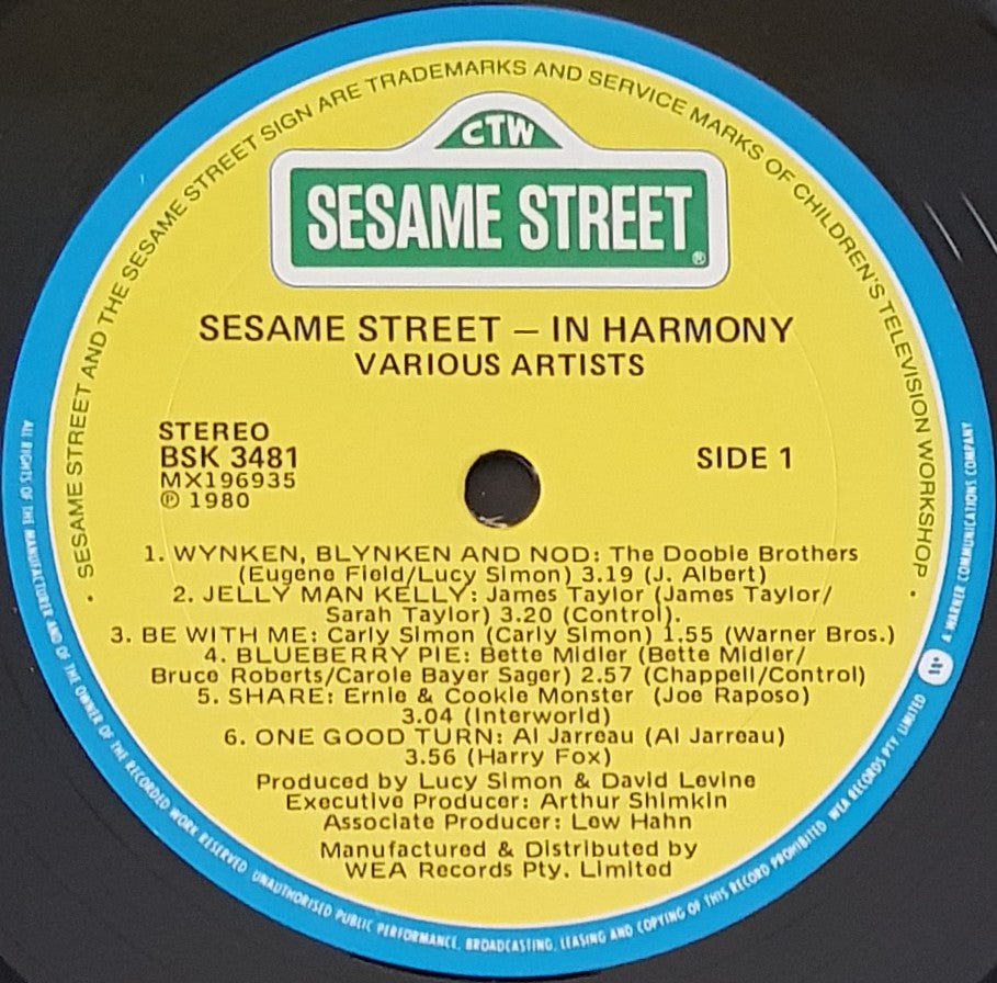 1980 Sesame Street Records BSK 3481. Features The Doobie Brothers, James Taylor, Al Jarreau, Carly Simon, Linda Ronstadt, George Benson and Others. Minor wear on cover