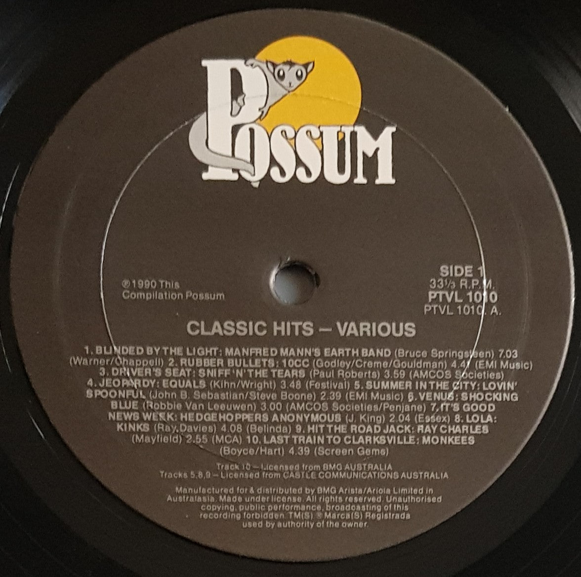 1990 Possum Records PTVL 1010. Deletion Corner Cut on Cover. Manfred Mann, 10C.C., Monkees, Golden Earring, Kinks +++