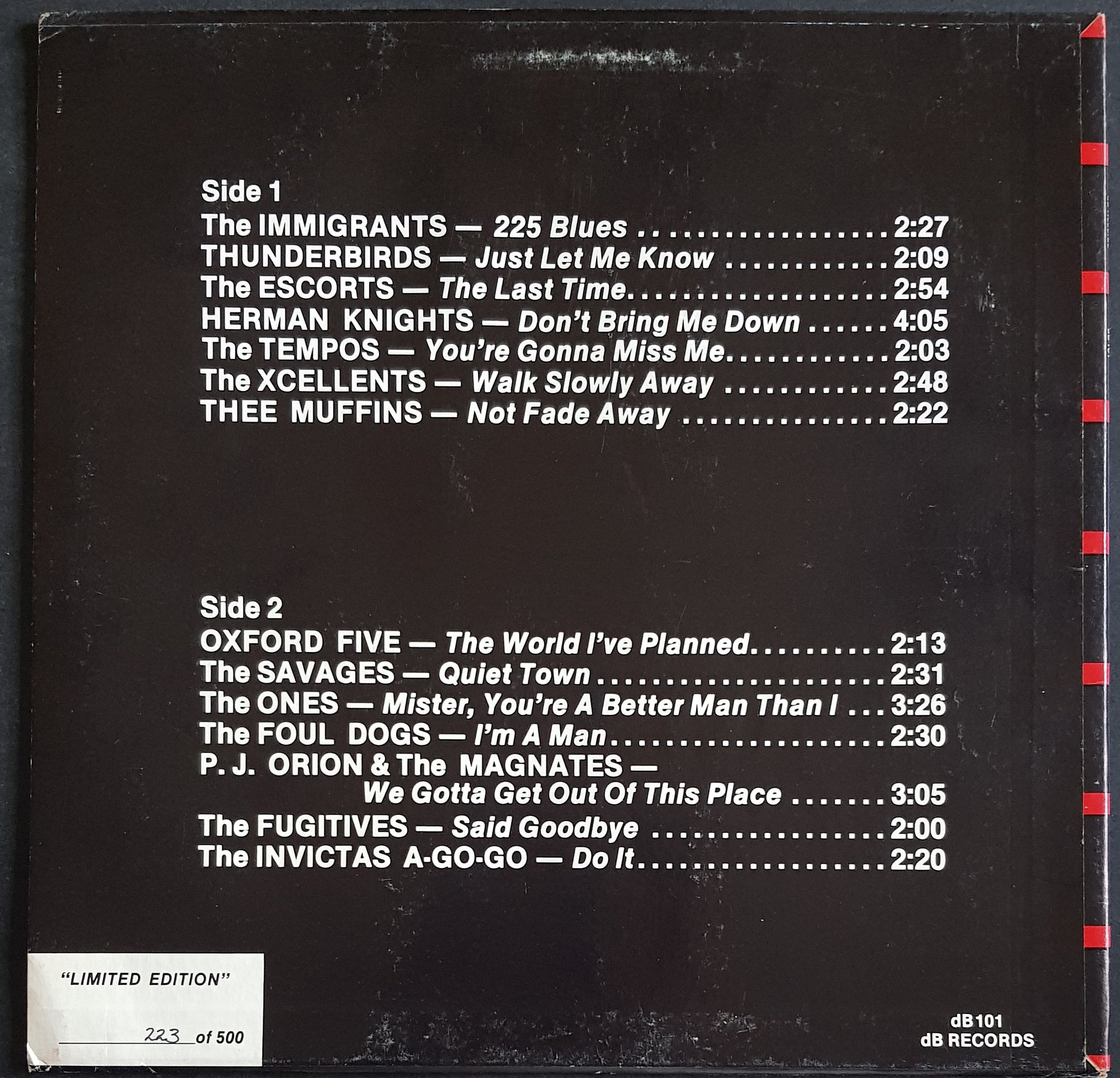 Garage Rock Compilation. 1982 DB Records dB101. # 223. Minor Wear and Corner Creases on Cover. Paper scuffs on disc