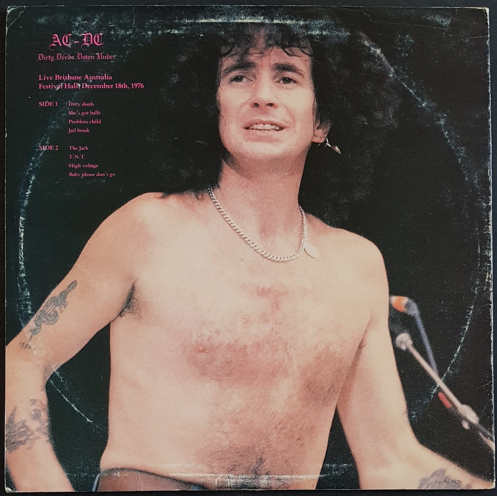 Deluxe Printed Colour Cover. Printed White & Black Labels. Matrix# AC-1/2. Live In Brisbane 1976. Heavy ring wear on cover, edge wear with creases.