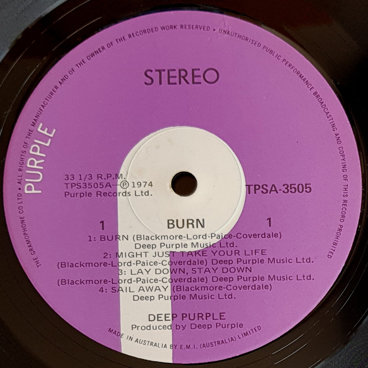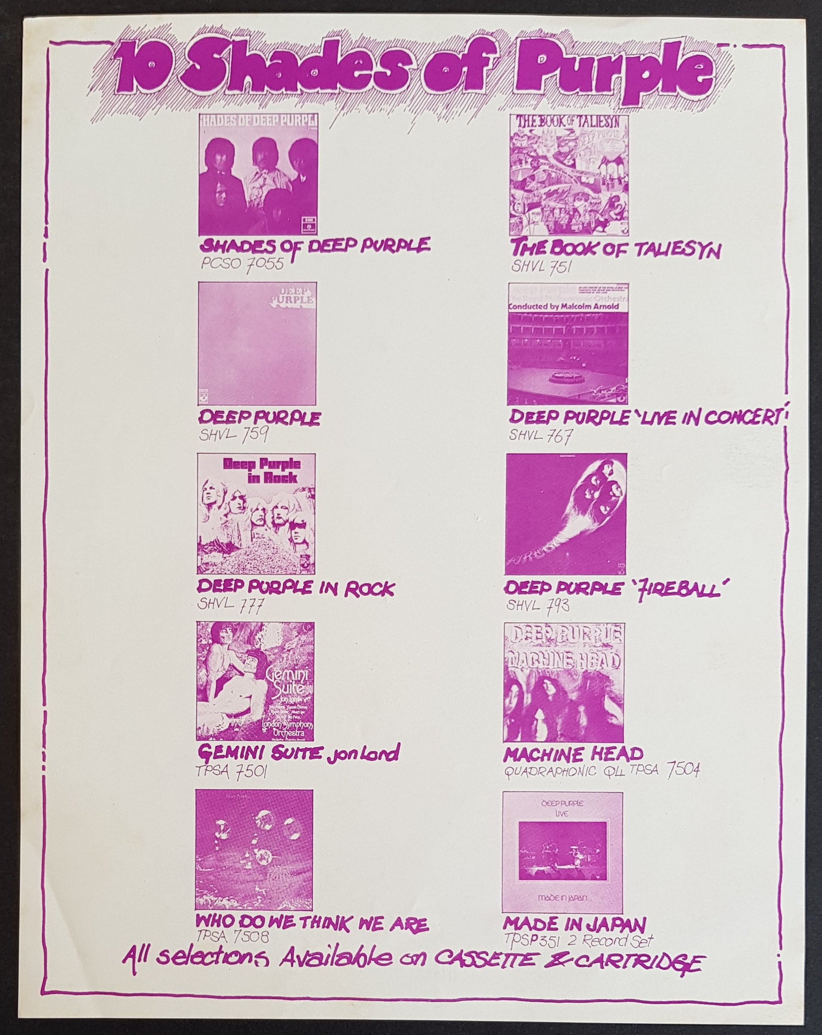 1974 PURPLE Records TPSA-3505. Font on labels is thin. Comes with Purple & White 10"x8" Insert which has band photo on front & discography on rear