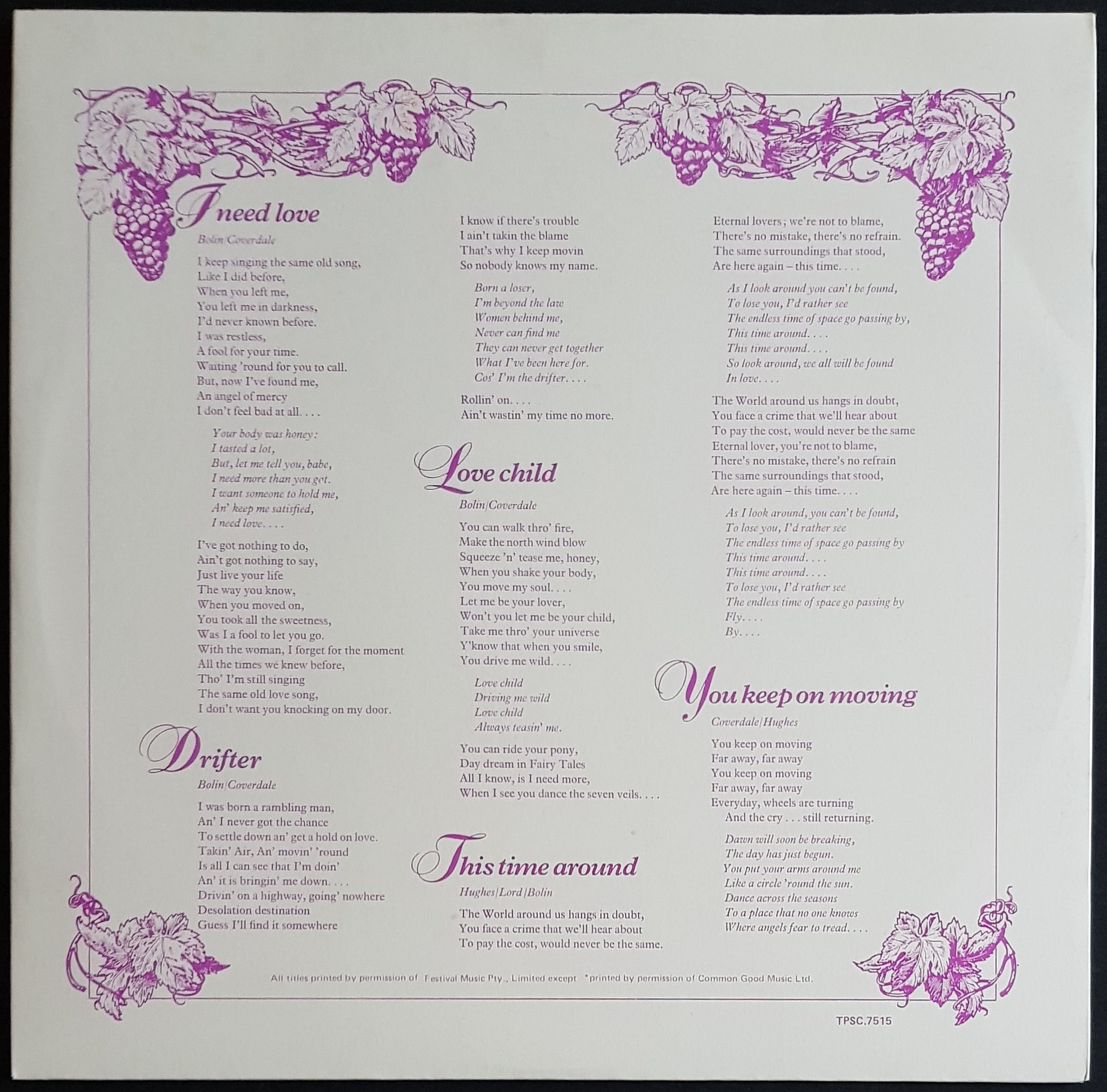 Gatefold Cover w. Card Inner Sleeve. 1975 Purple Records TPSC 7515.