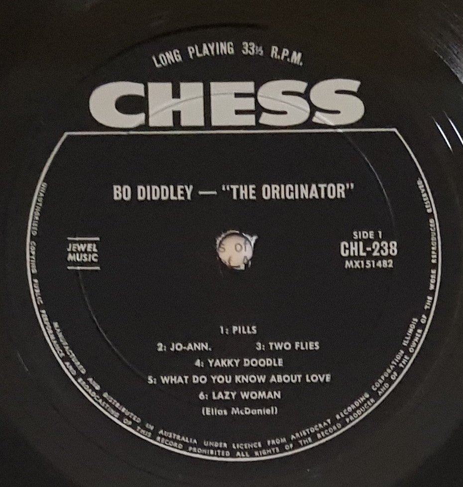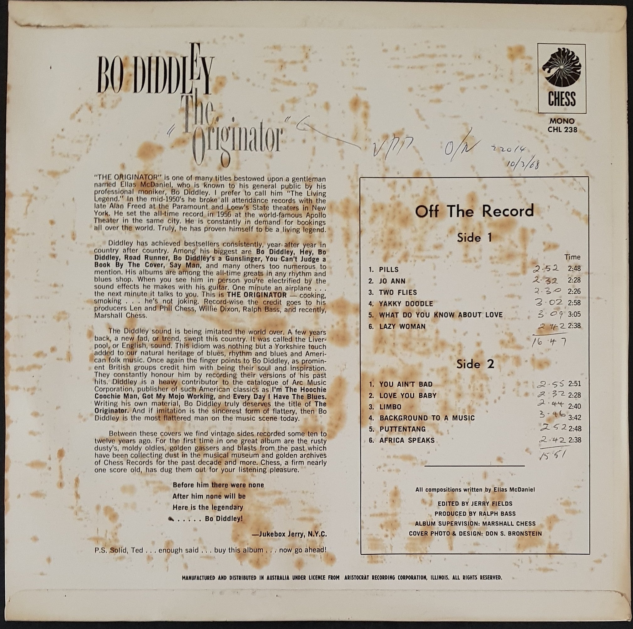 1966 Chess CHL-238. Front cover is laminated and brilliant, glossy with relatively sharp corners. Has come from Radio Station Record Library and was stored in a tar lined jacket which has stained the back cover as the board is not laminated, as there is some writing too.