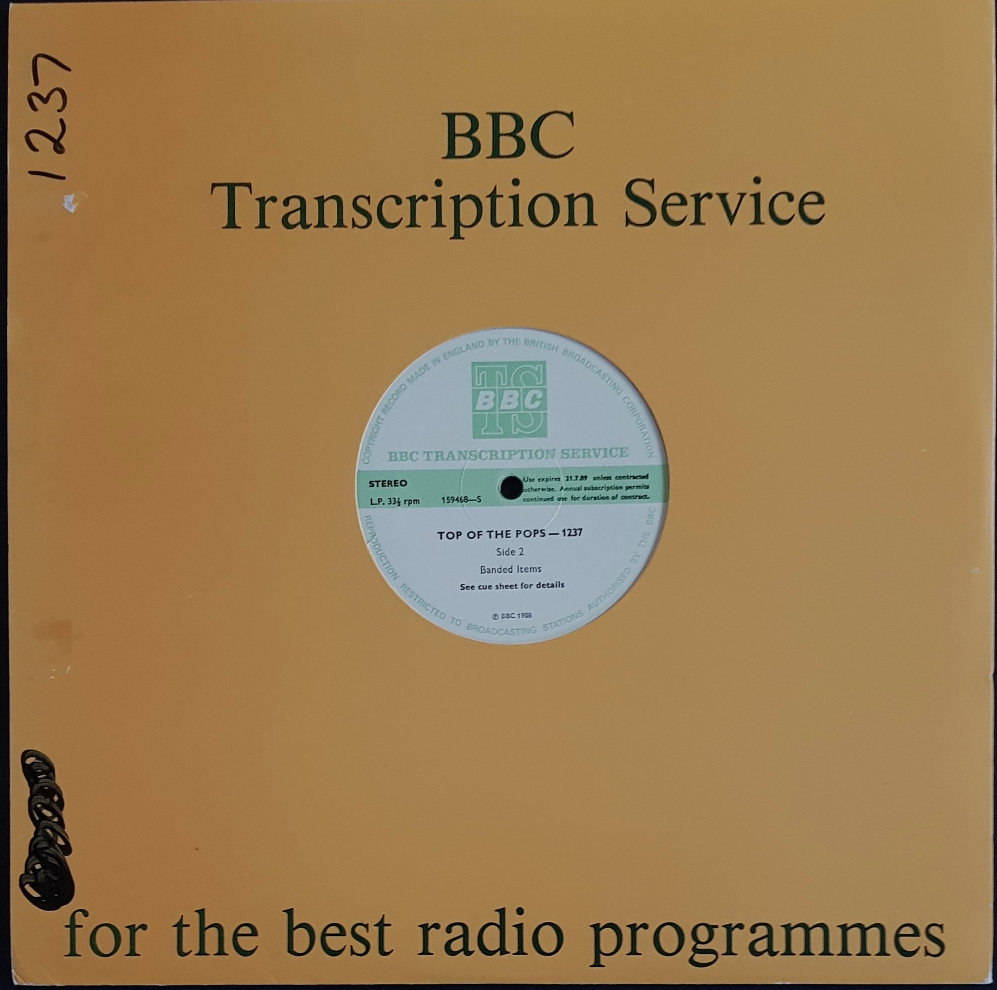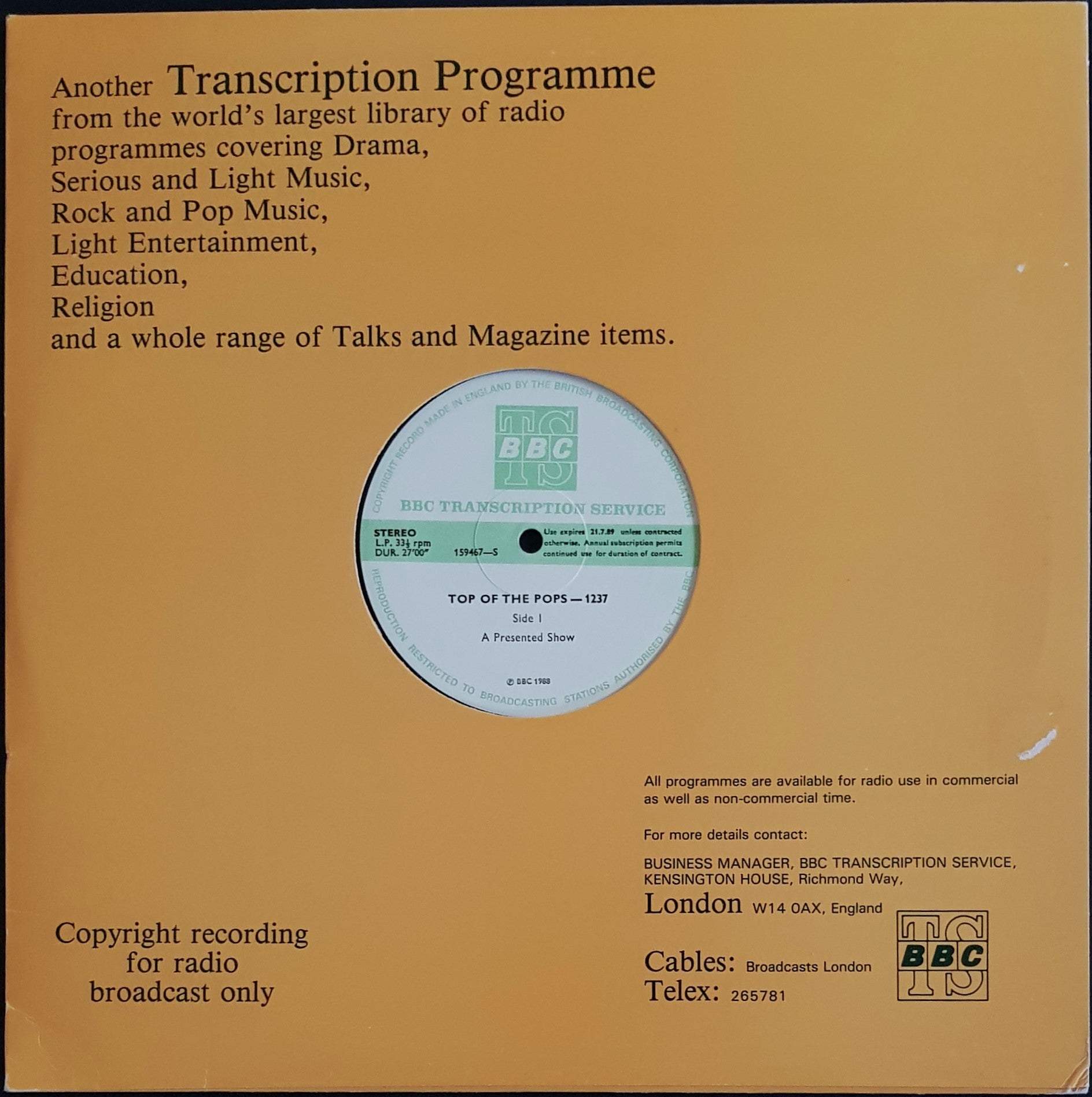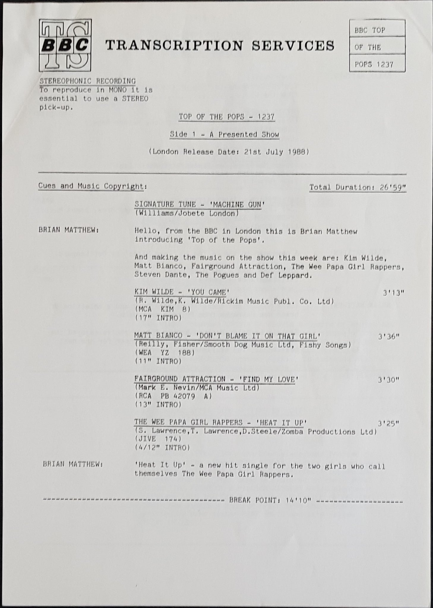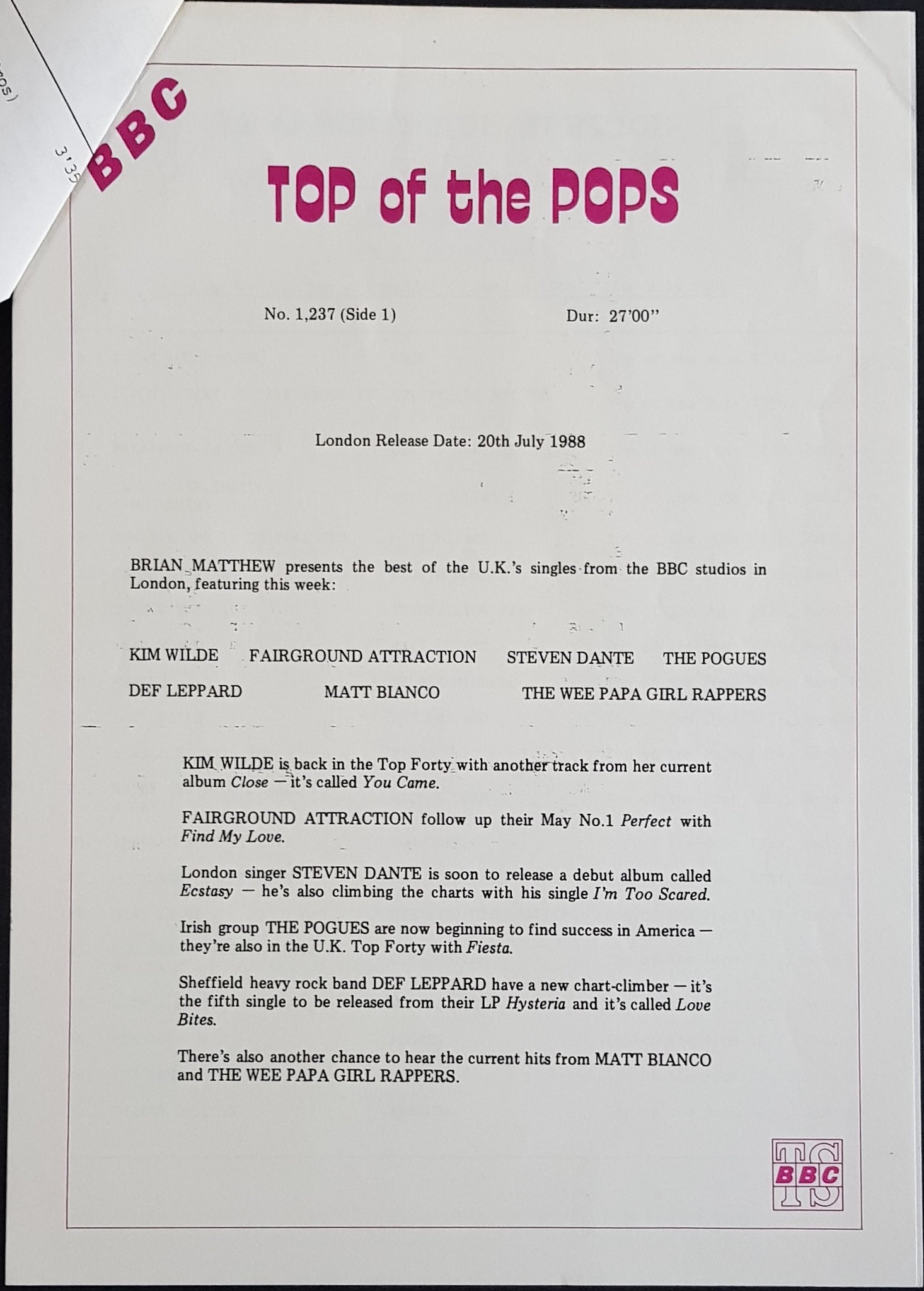BBC Transcription Disc w.Cue Sheets. London Release Date July 21, 1988. Show Features the new Single "Love Bites". Kim Wilde, The Pogues. Generic BBC Cover has Writing & Small Tears.