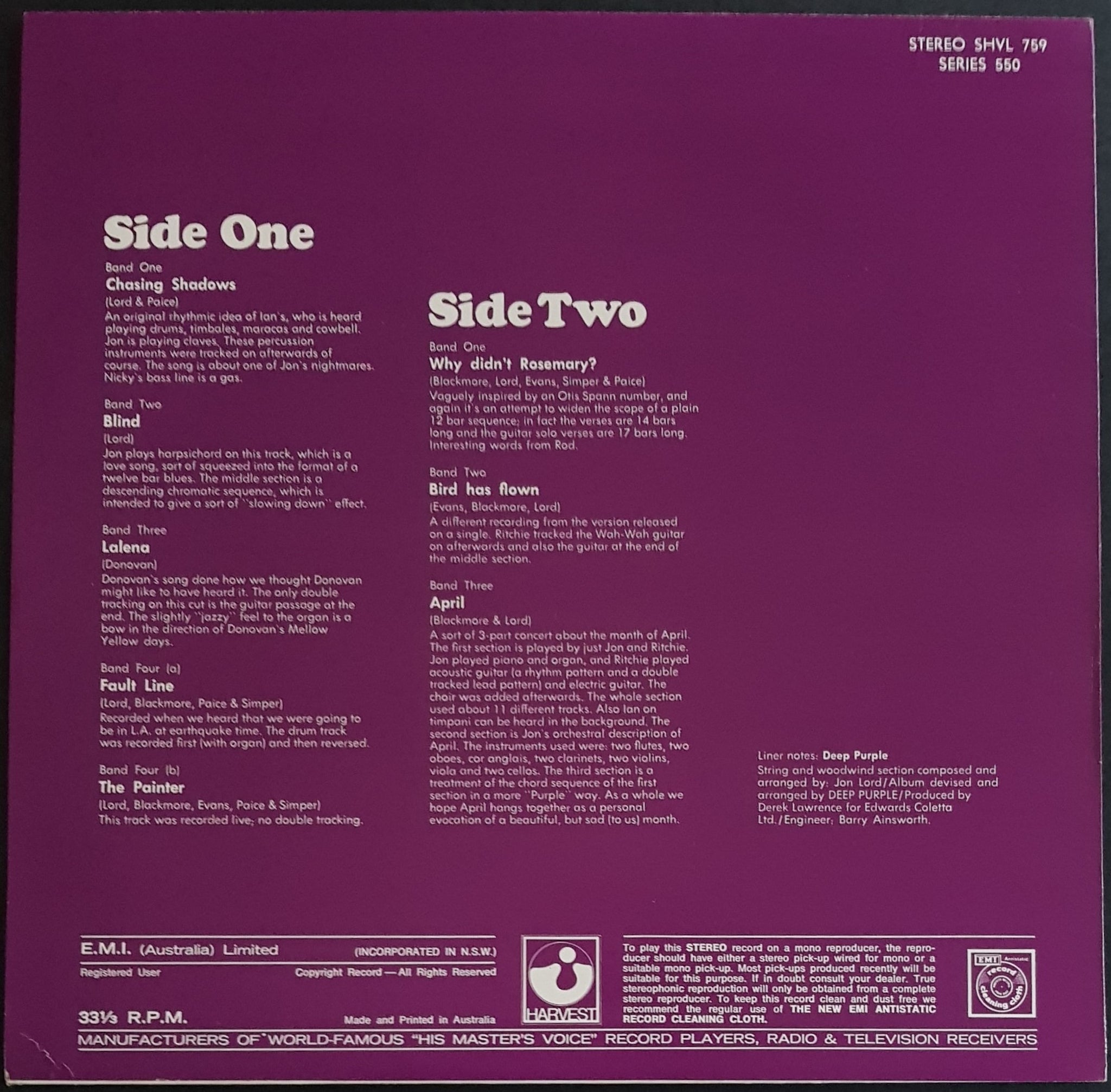 Unique Purple & White Cover. Darker Unlaminated Cover. 1972 Harvest SHVL-759. Minor Scuffs on Disc. Unfortunate corner crease on otherwise EX cover