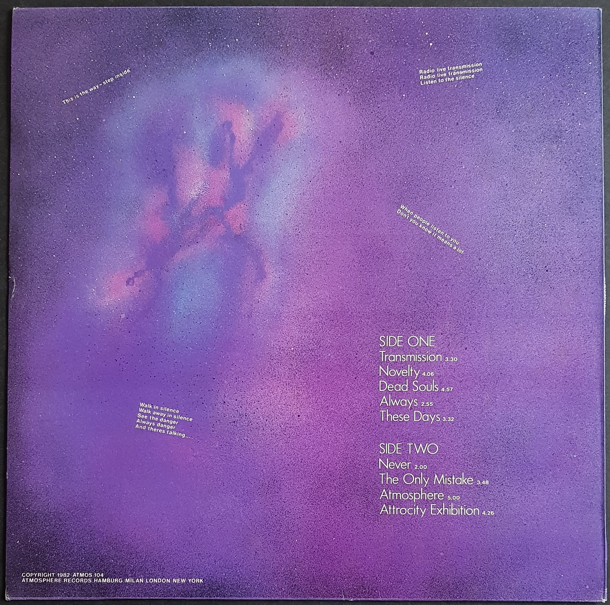 1982 ATMOS 104. Printed Cover. Plain White Labels. Matrix ATMOS-1-A1/B. "Transmission" sessions at Central studios - Manchester mid July 1979 & Piccadilly Radio session at Pennine studios - Manchester 4 June 1979. Foxing and small tear on cover at opening