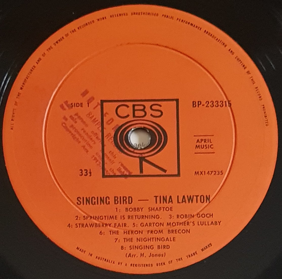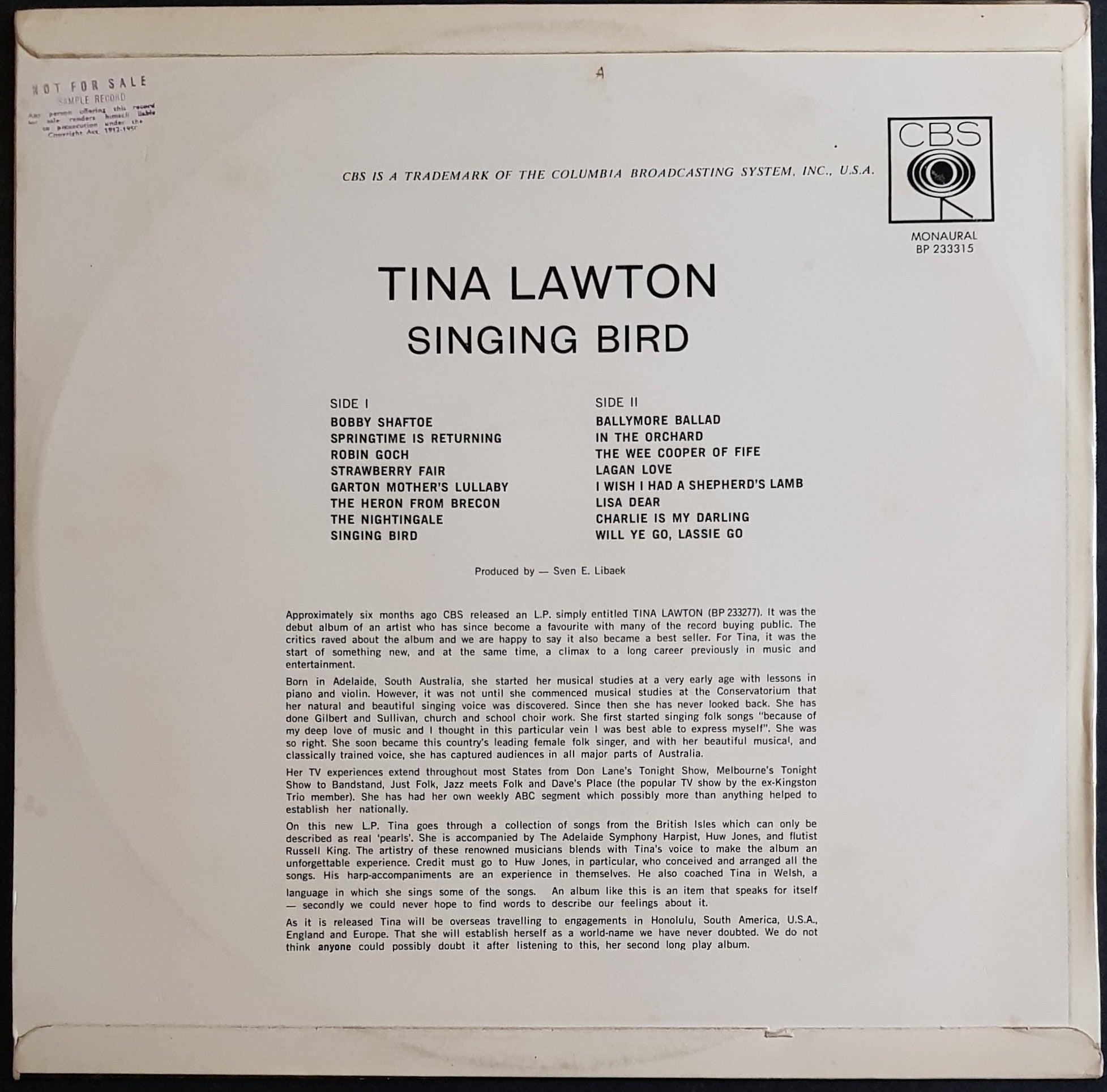 1966 Original Orange MONO CBS Label BP-233315. Brilliant Female Folk Vocalist. Sample Record Ink Stamp on Cover & Label. Laminated front cover has minor scuff / wear marks, small corner crease and small dings to opening corners. Minor ring wear on back cover. Disc is very clean, however old style clear plastic inner has caused visual scaring to disc, not effecting play.