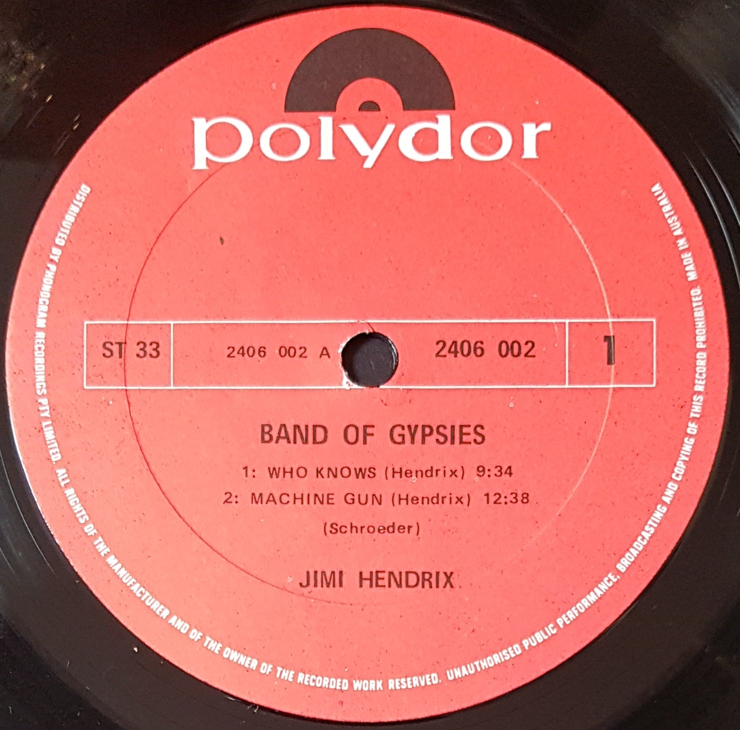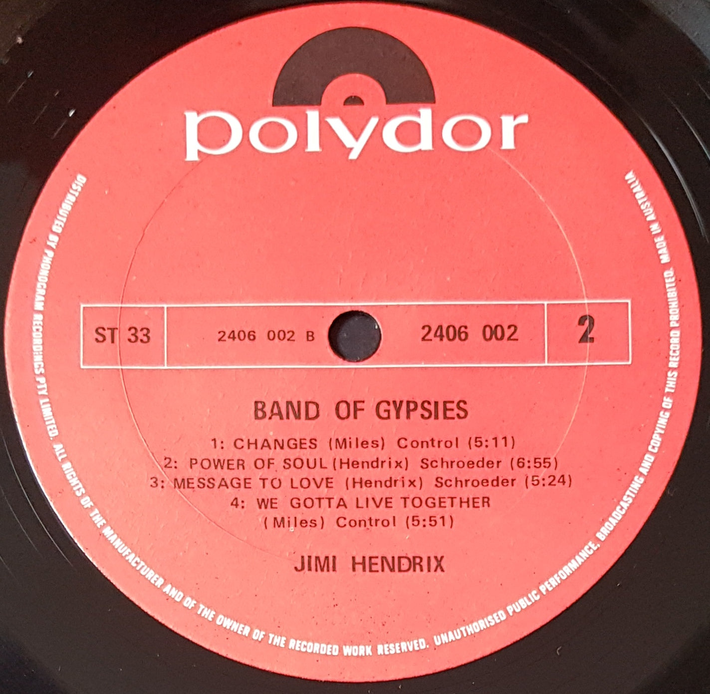 Fully Laminated Puppet Cover. Spelt 'Gypsies' On Label. Red POLYDOR 2406002. Small Split on Spine. Disc has Shallow mark on 'Message To Love'. This is the earliest label issue from Australia