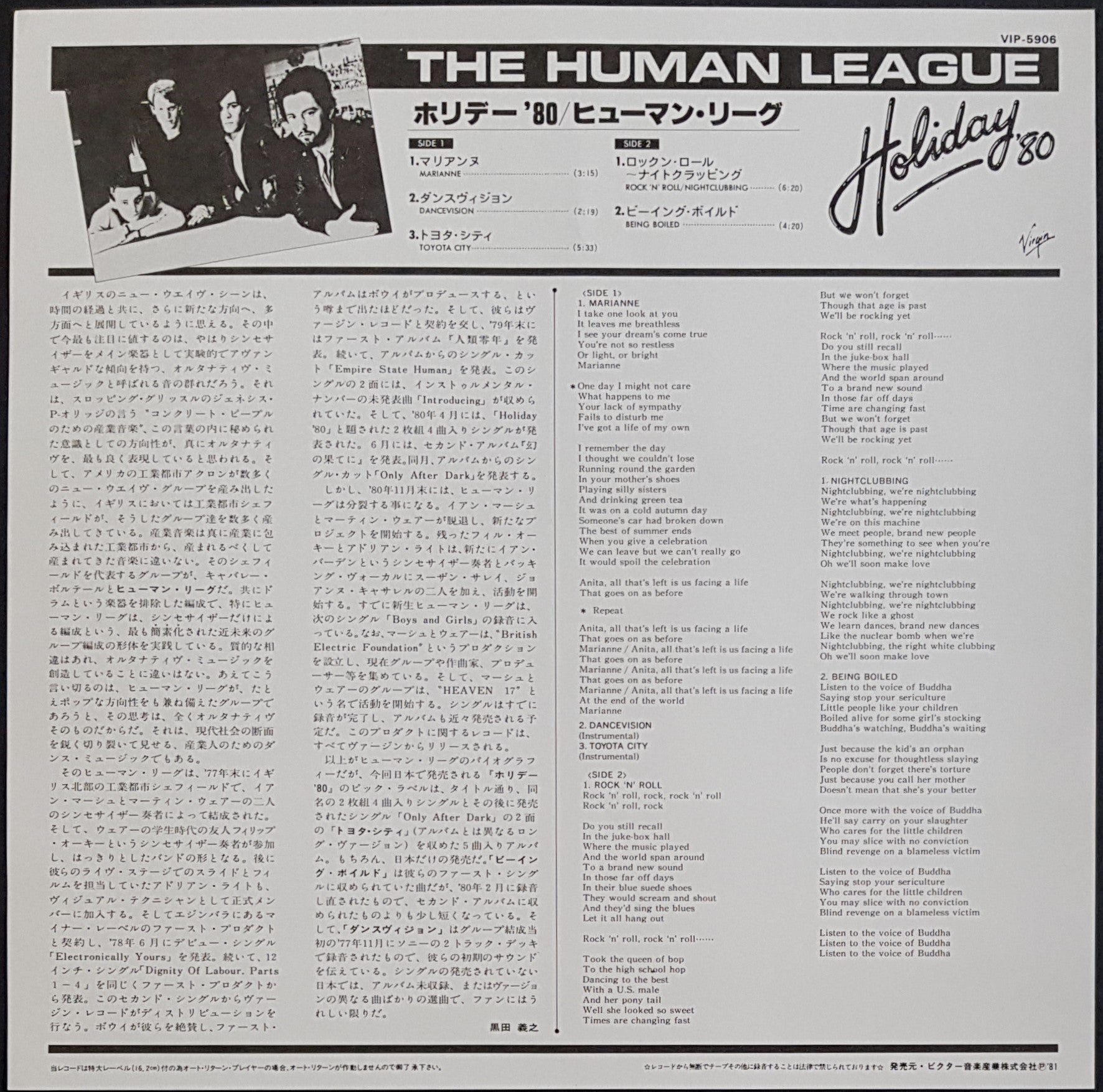 EP PS. Large Picture Label Complete w.OBI & Insert. 1981 Virgin VIP-5906. Handling Creases Along Spine & Minor Wear on Cover. Minor scuffs on disc