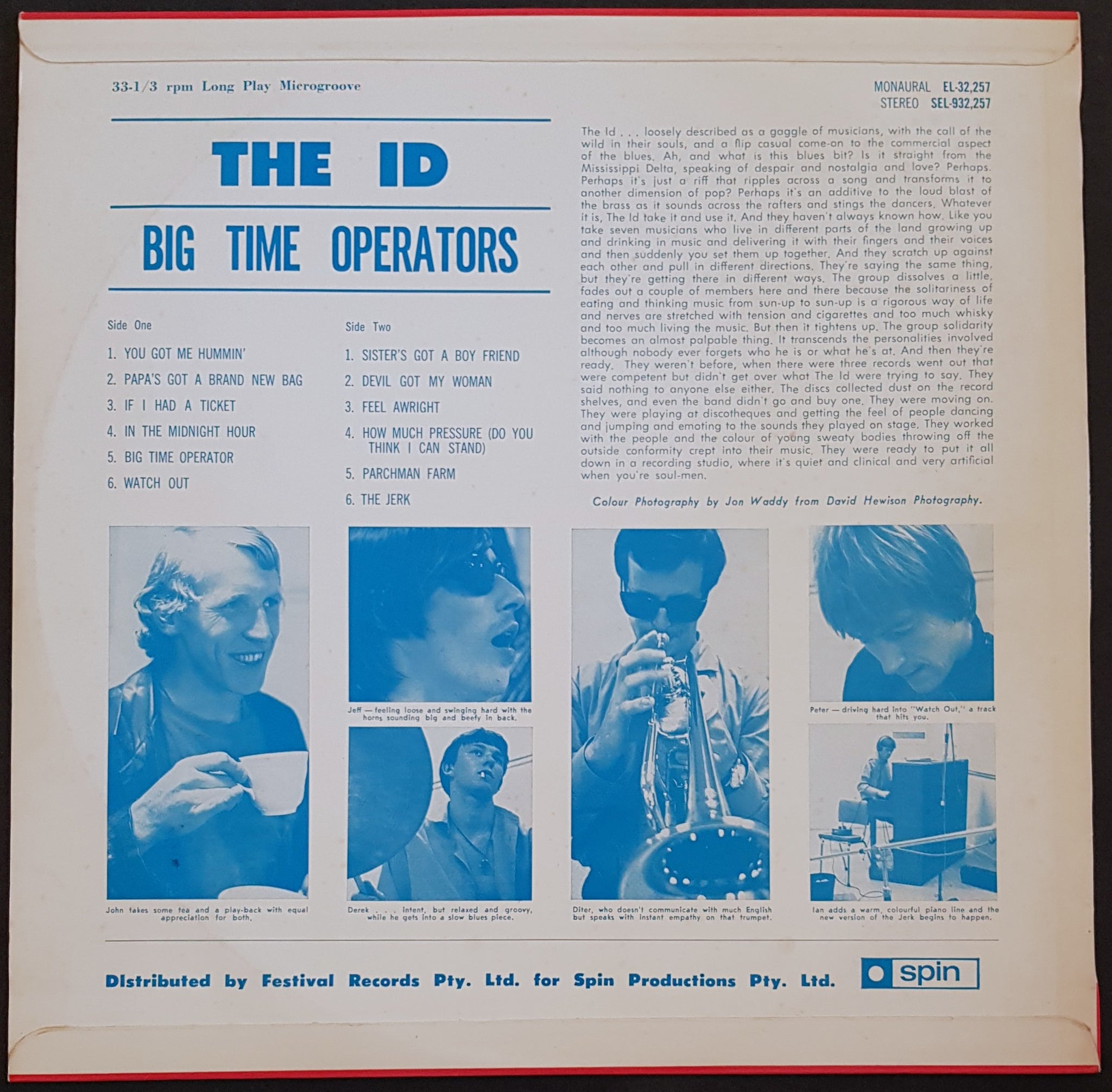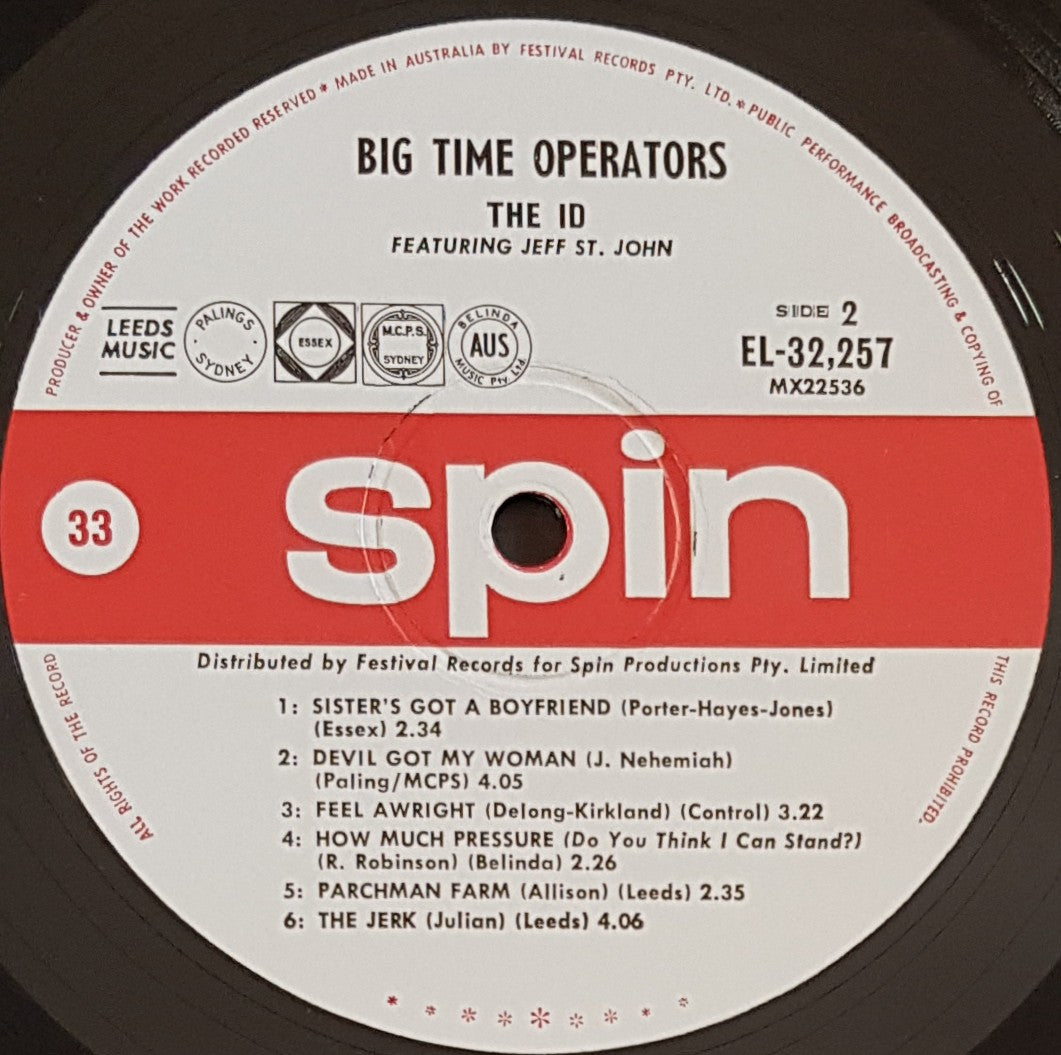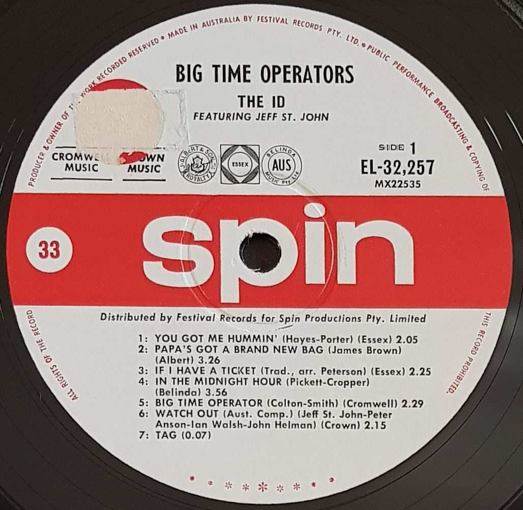 1967 Original SPIN MONO EL-32,257. SUPER CLEAN COPY!!!! Laminated front cover has minor wear. Some foxing on back cover. It's EX. Disc is very clean, EX. Sample Record sticker has had a small piece of tape placed over it, and removed to tear the sticker and a small part of the label. Smallpiece of debris pressed into vinyl causing 3 minor ticks at end of Big Time Operator