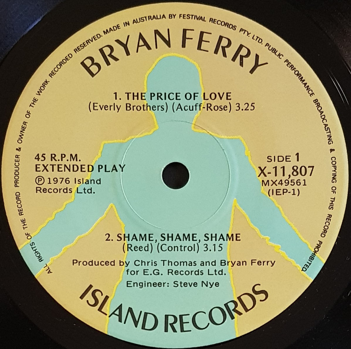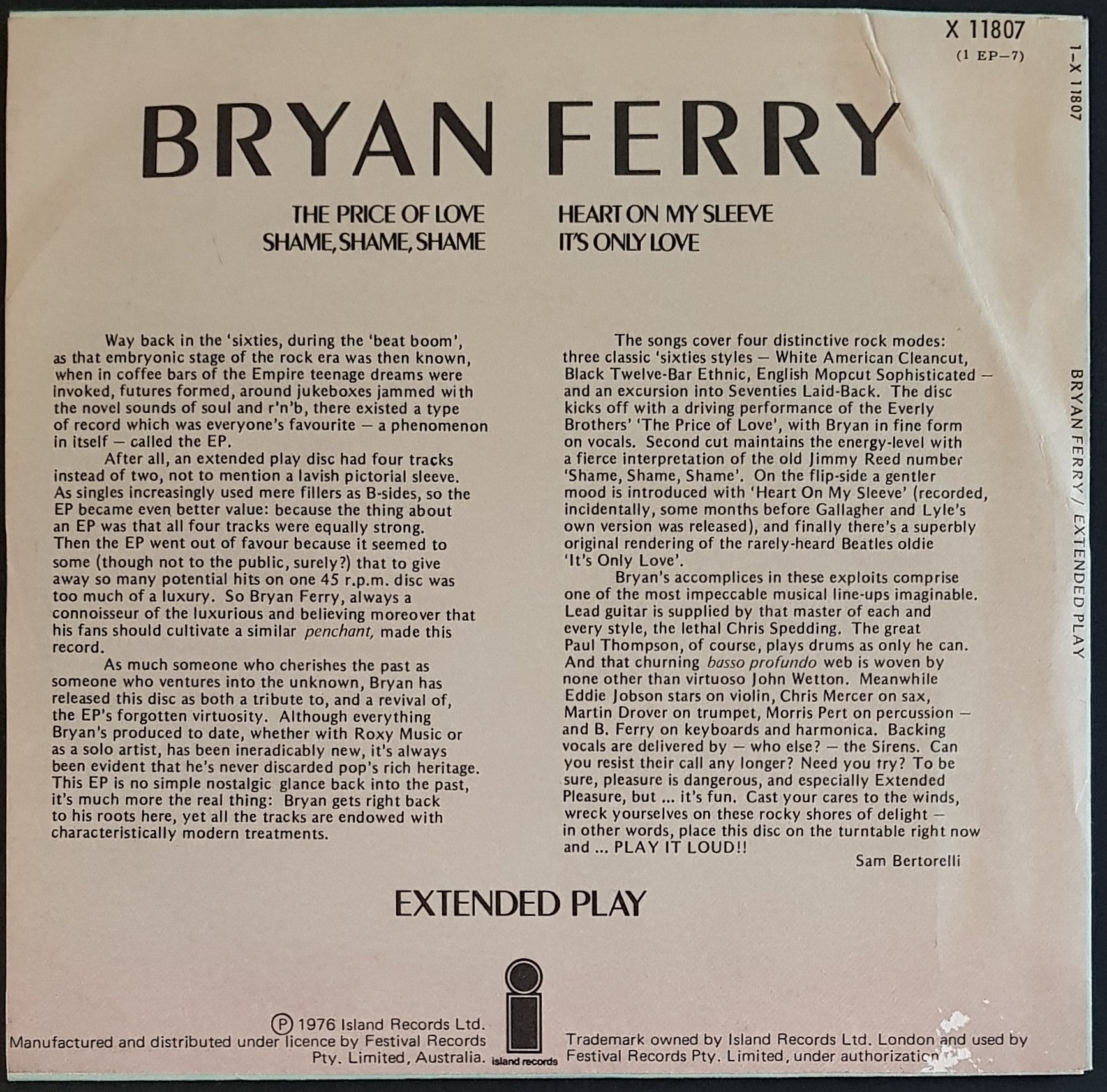EP PS. 1976 Island Records X11807. Sleeve has heavy crease on one corner and minor silverfish damage on rear.