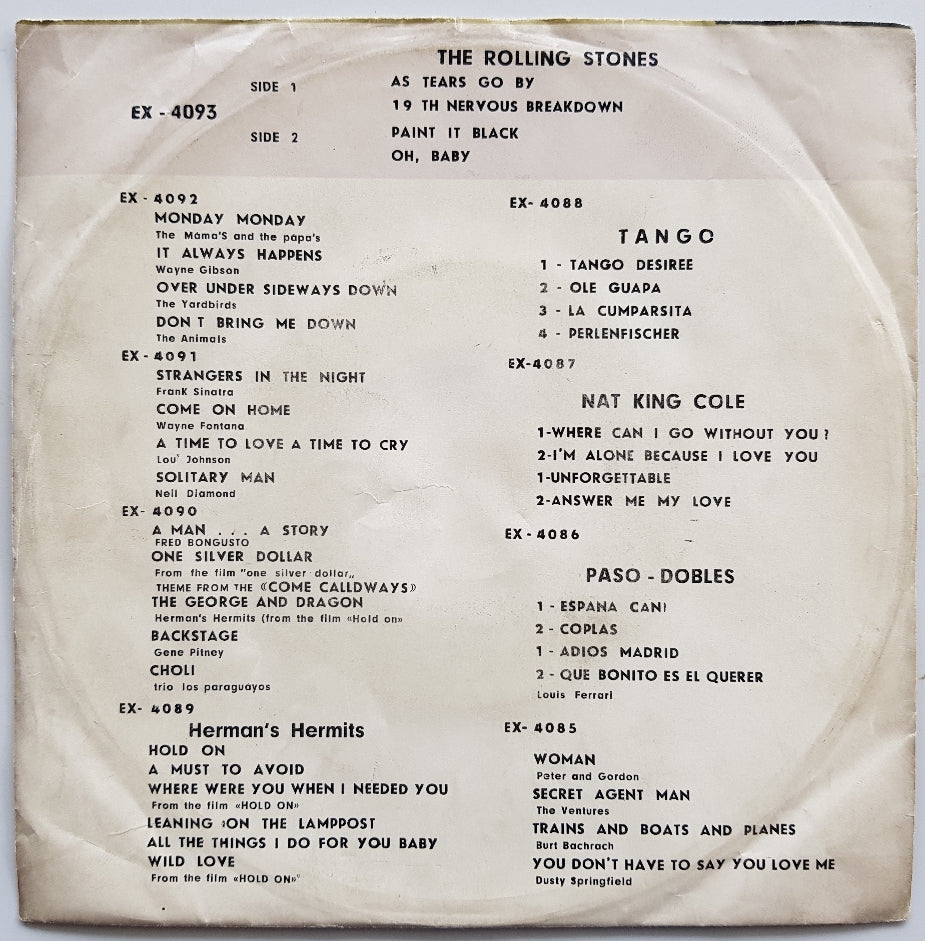 EP PS. All Tracks by the Stones. Late 60's Top 4 EX 4093. Sleeve is a little soiled on the rear