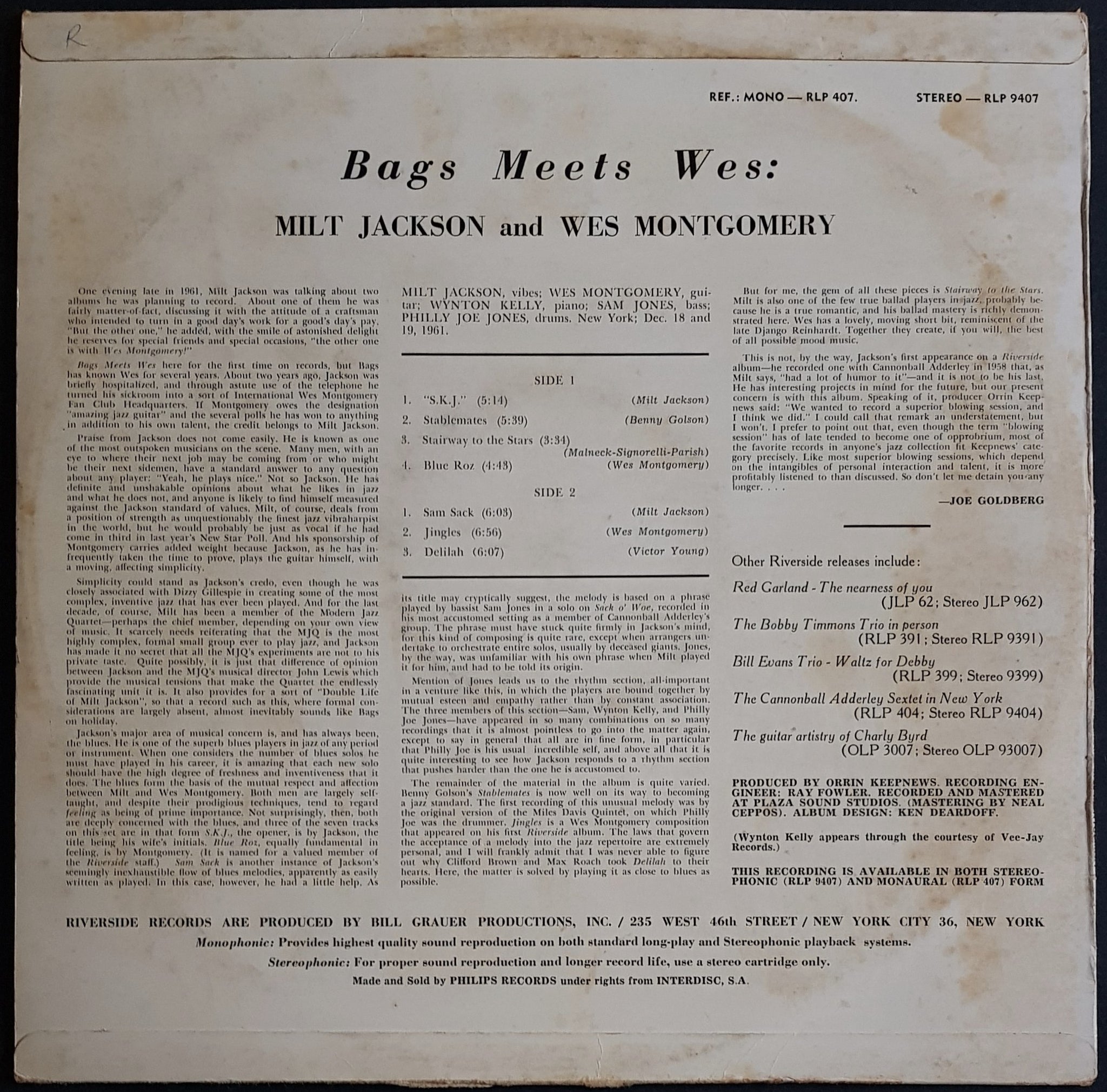 1962 Riverside Records RLP 9407. Front cover has scuffs and minor creases. Back cover has heavy foxing, small writing (original owners initial "R") and a 3" split on bottom seam.