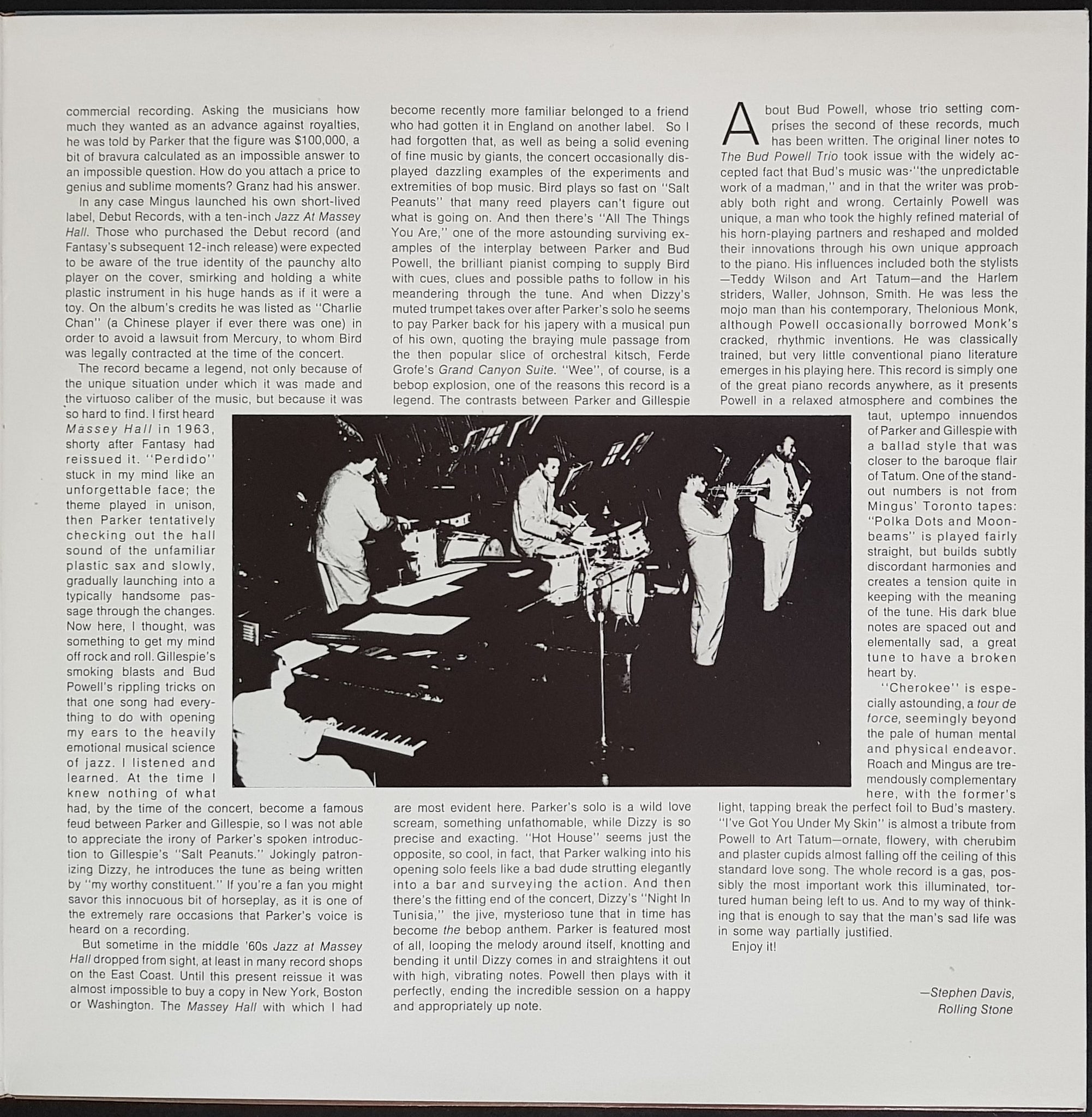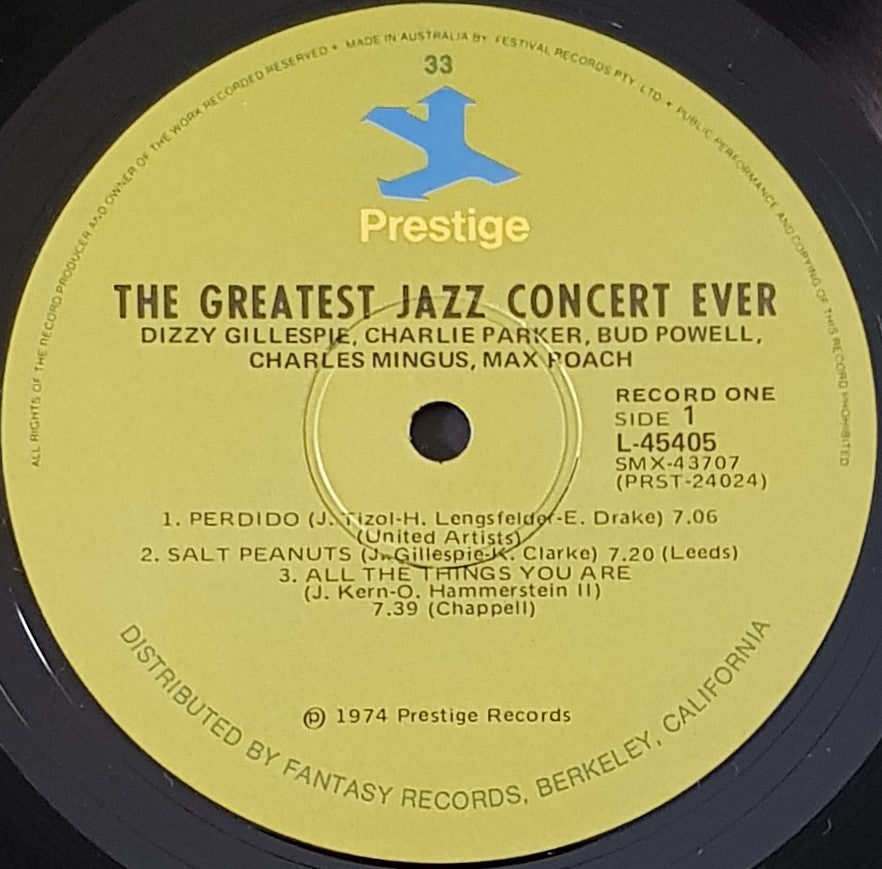 Features Charlie Parker, Dizzy Gillespie, Bud Powell, Charles Mingus & Max Roach. 1974 Prestige L45405/6. Ring wear on gatefold cover.