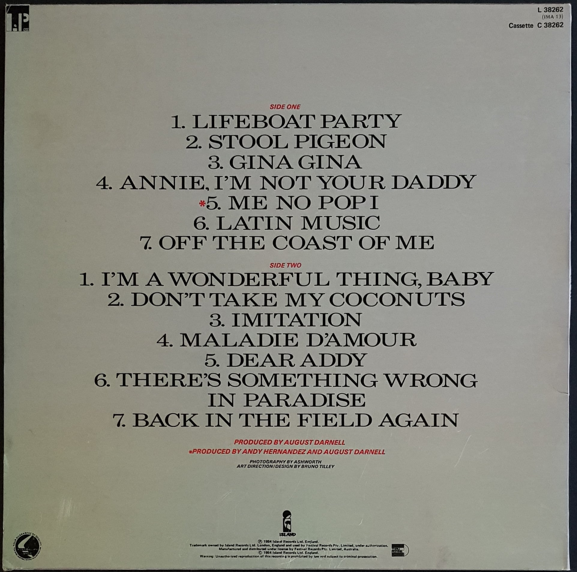 1984 Island Records L38262. Cover has minor surface wear, corner crease, light creases along spine and edge wear at opening. Back cover has cat like scratch marks and a small surface scuff. Minor scuffs on disc