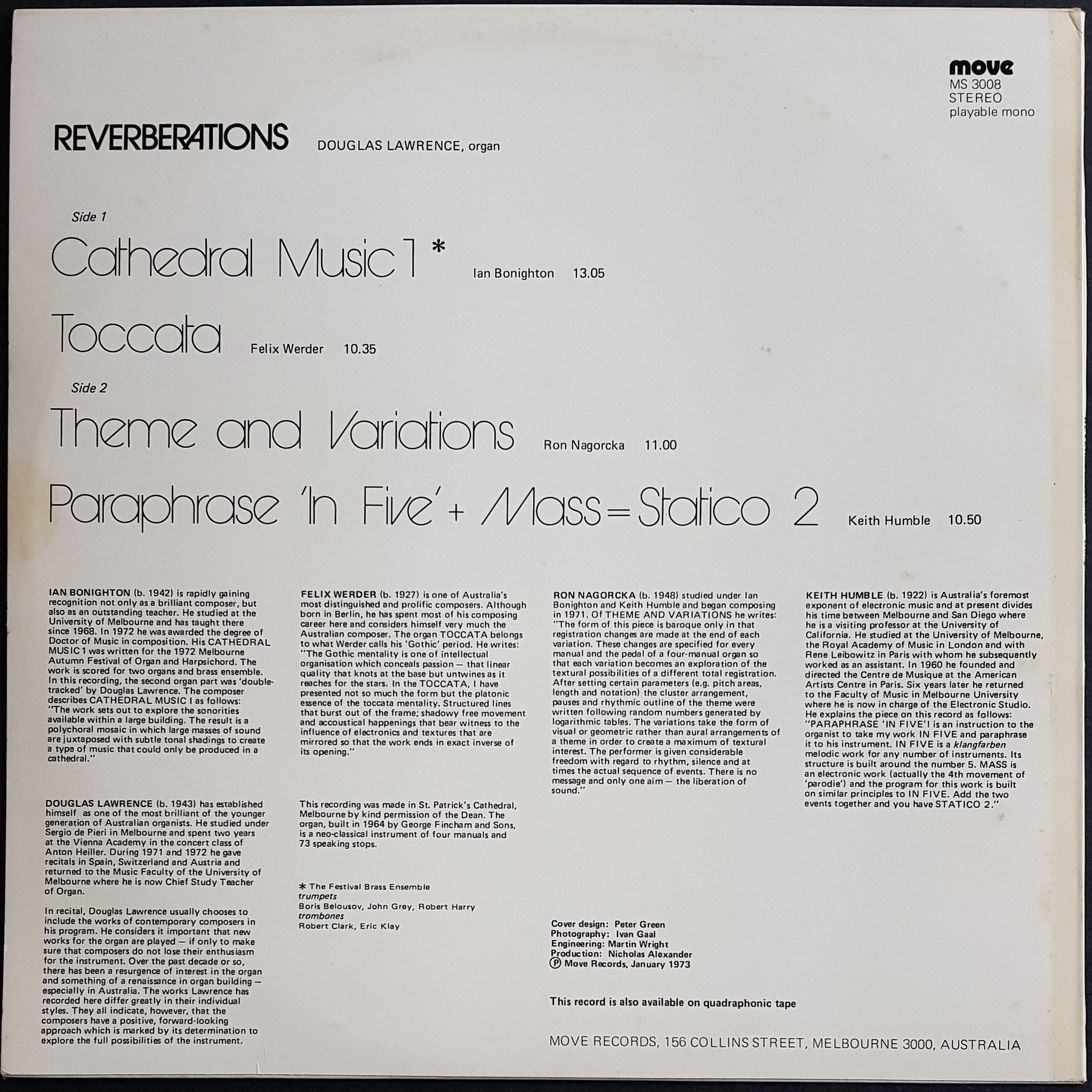 1973 Move MS 3008. Minor wear, small sticker stain and foxing on back cover. Performers include Ian Bonighton, Felix Werder, Ron Nagorcka & Keith Humble