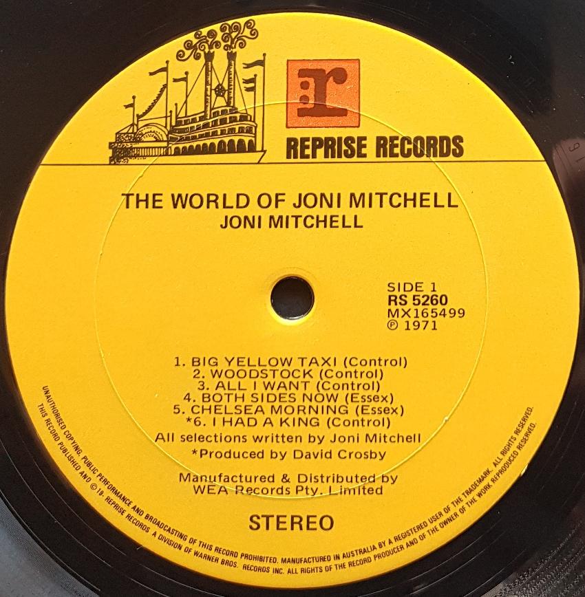 1970's Reprise Records RS5260. A couple of ticks on 'Woodstock' caused by tiny needle drag. Ring wear on cover.