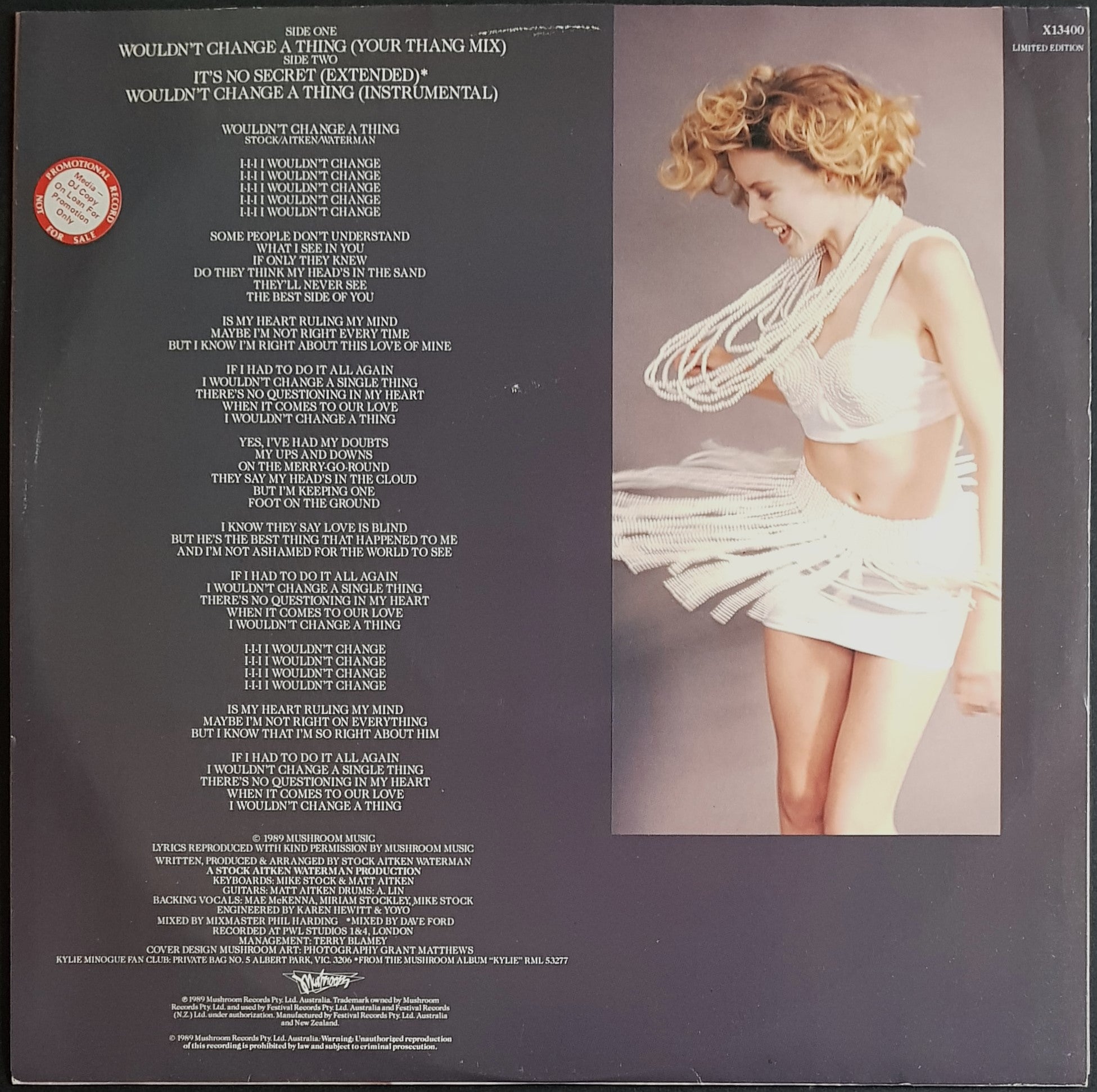 PS. w.Wouldn't Change A Thing (Instrumental) + It's No Secret (Extended). 1989 Mushroom X13400. Promo Sticker on Back Cover