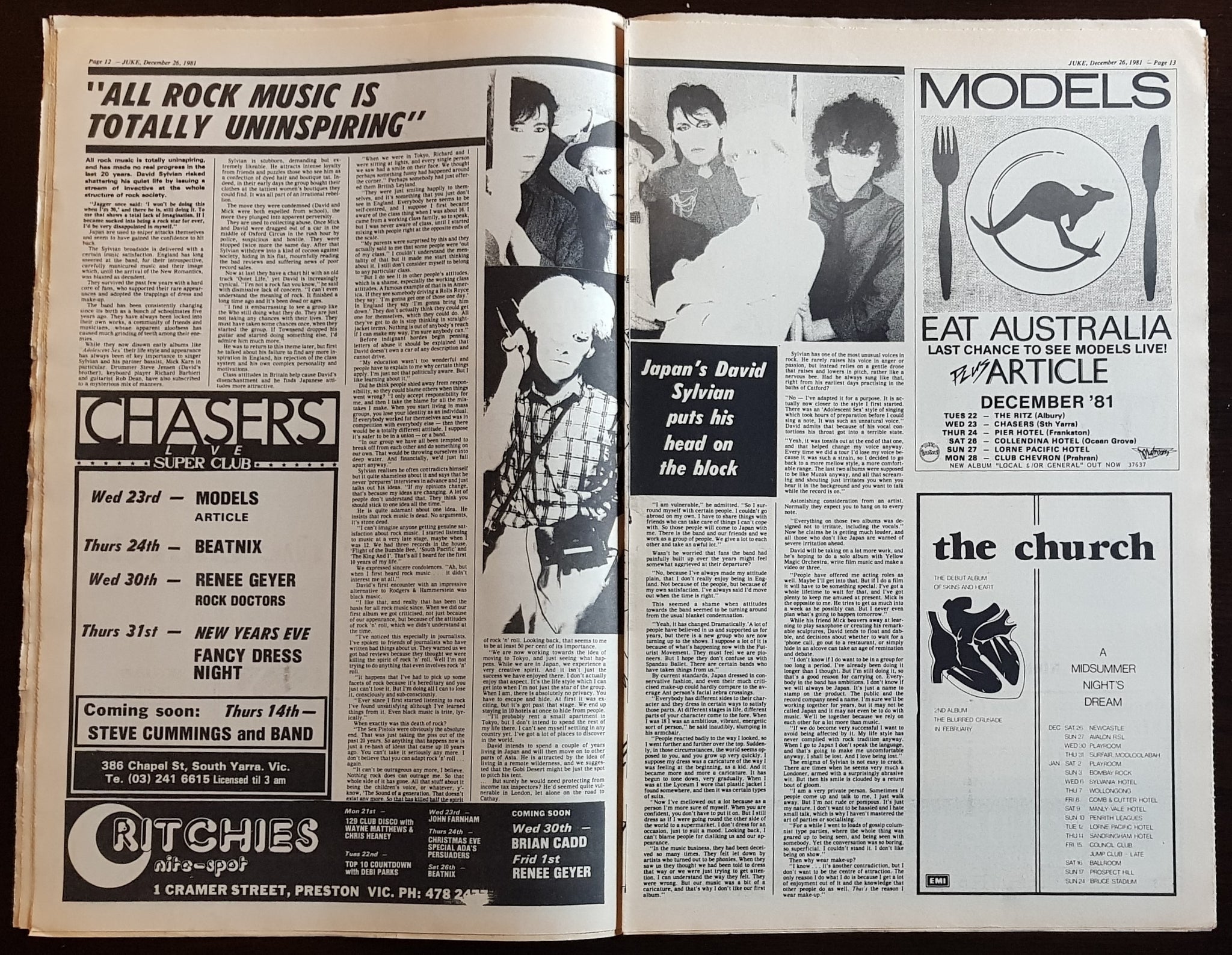 w. Stevie Cover & Article. Issue Also Features, Reviews And Or Has Ads For Models, Japan - David Sylvian The Church, Cold Chisel + Others. Writing on Cover