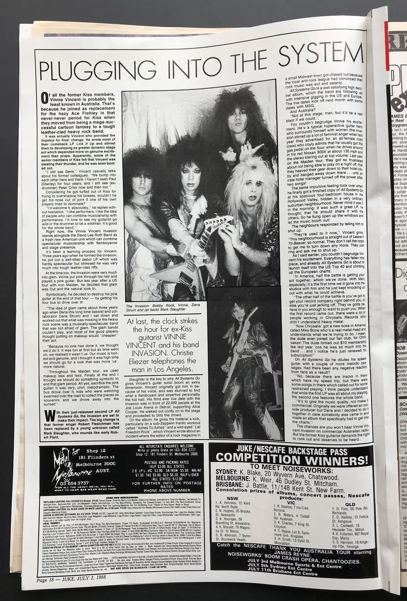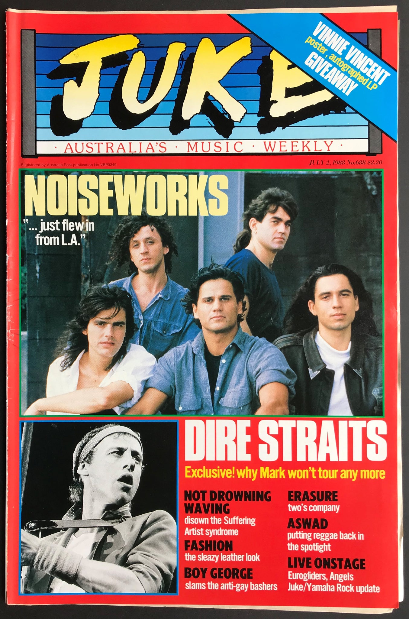 w. Noiseworks Cover & Article. Issue Also Features, Reviews And Or Has Ads for Erasure, Not Drowning Waving, Boy George, Vinnie Vincent (Kiss) Colour Poster, The Angels, Megadeth & others.