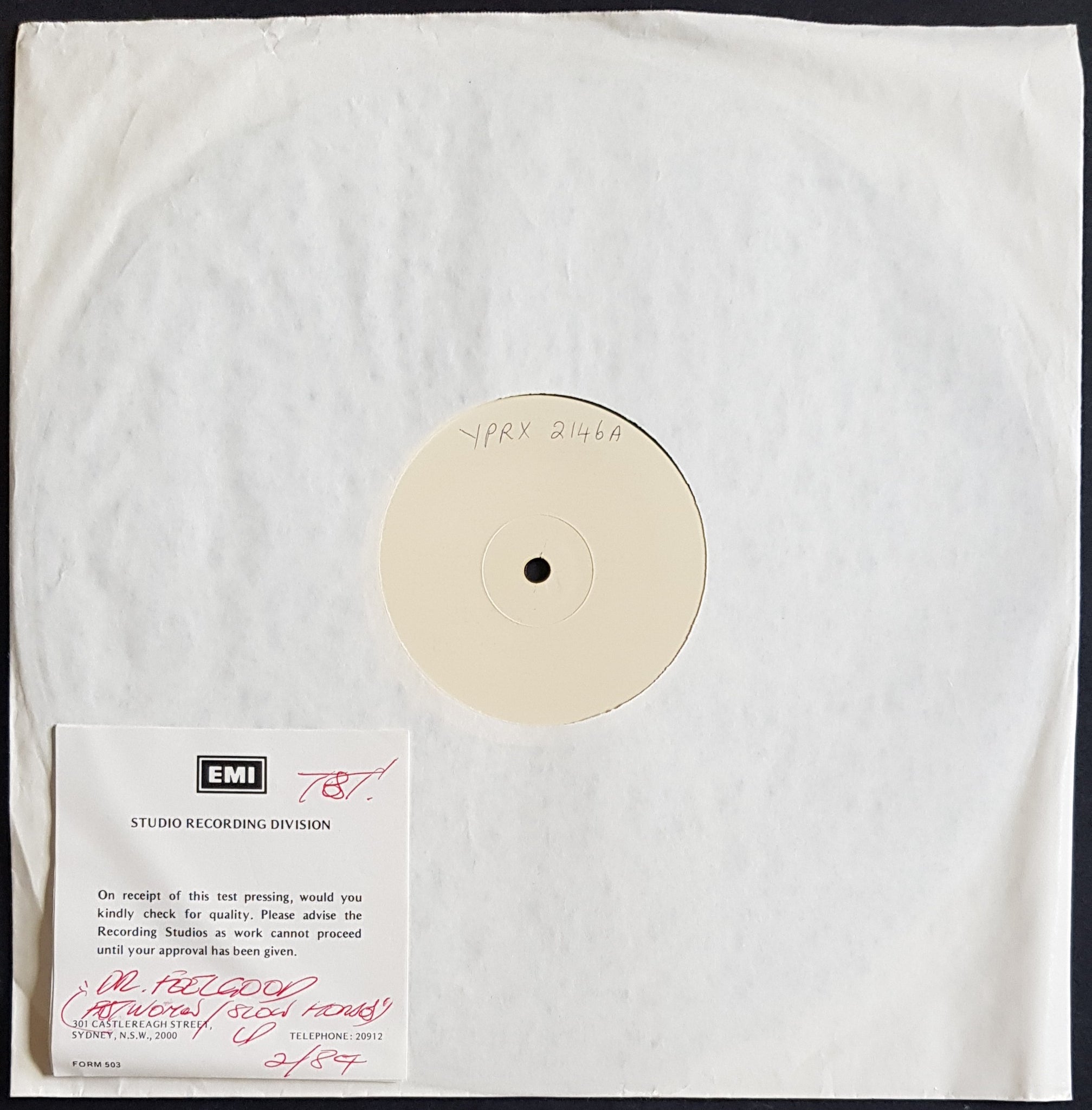 White Label Test Pressing. 1982 EMI Custom YPRX 2146. w/ EMI studio insert