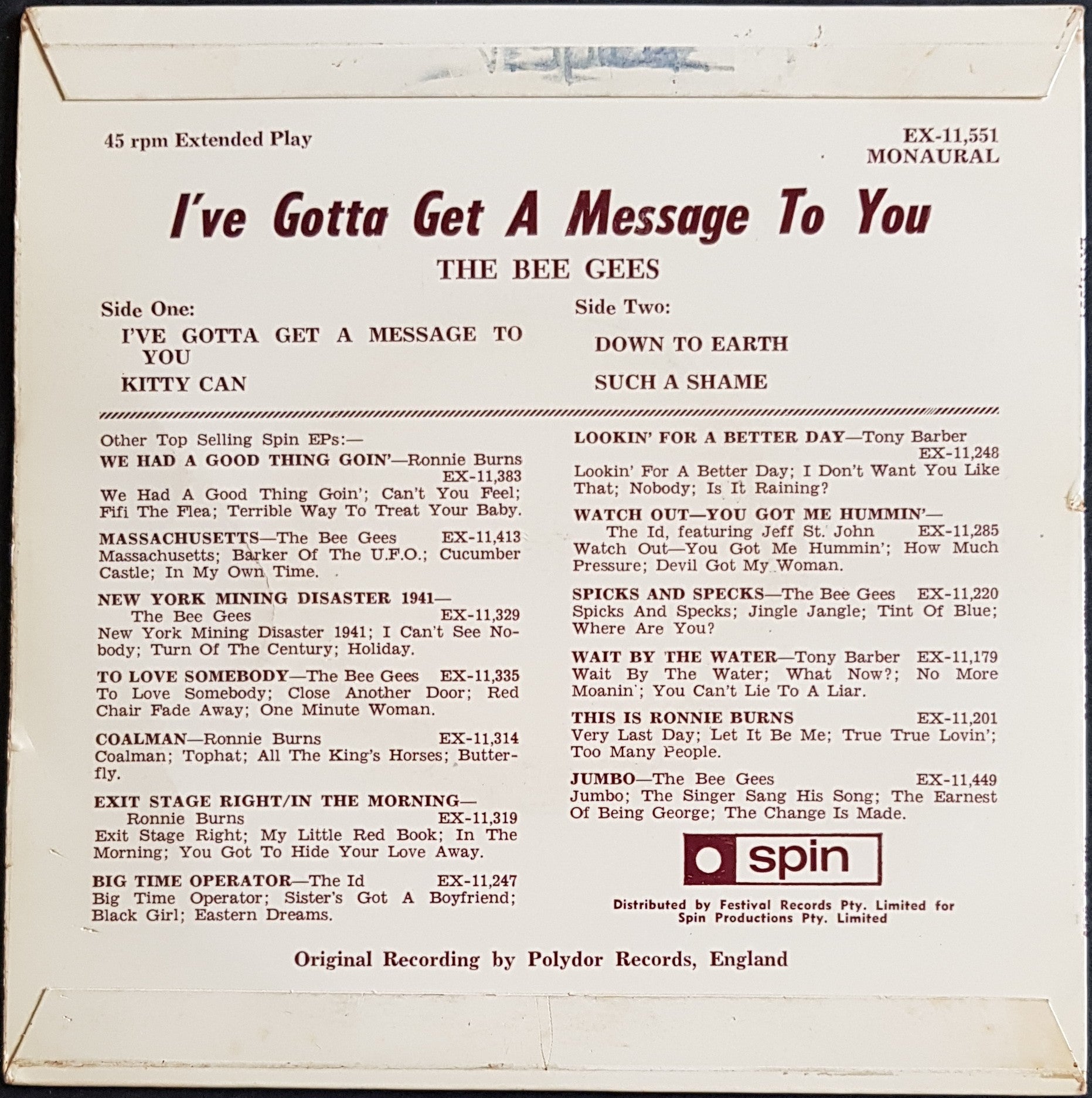 EP PS. 1969 Spin EX-11551. Bold font on labels. Laminated cover has minor scuff / wear marks and light creases. Small writing on unsealed board on rear and small bump on spine. Light scuffs and hairlines, with marks on Side 2 that will sound.